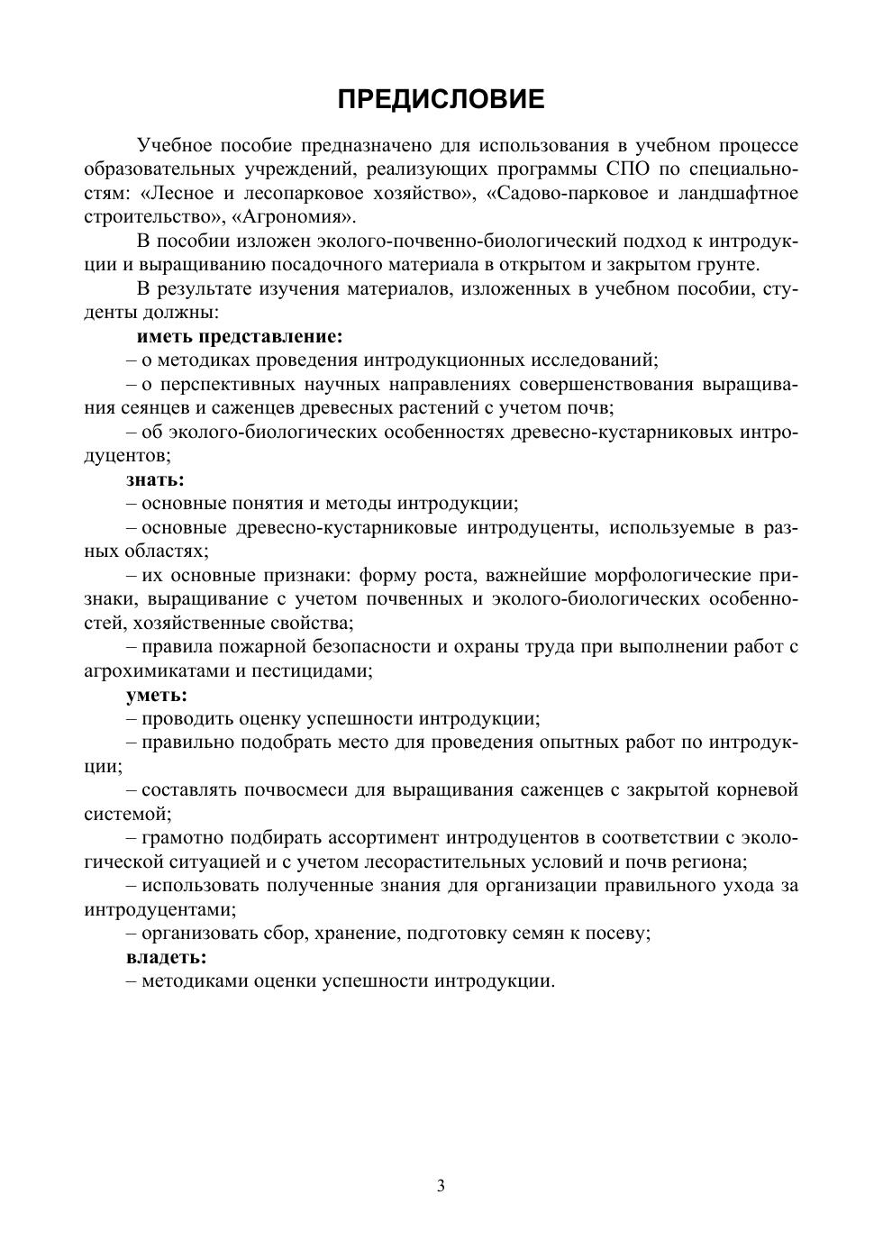 В учебном пособии описаны эколого-биологические и почвенные условия интродукции некоторых древесно-кустарниковых пород. Особое внимание уделено методикам, применяемым при интродукции. Приведены данные углубленного исследования почв, являющиеся основой интродукции растений по современным технологиям. Проведена оценка успешности интродукции лекарственных, витаминных и улучшающих среду обитания растений. Соответствует современным требованиям Федерального государственного образовательного стандарта среднего профессионального образования и профессиональным квалификационным требованиям. Для студентов лесотехнических, аграрных колледжей и техникумов, школьных лесничеств, для инженерно-технических работников лесного хозяйства, лесоустройства и садово-паркового строительства. В оформлении пособия использованы авторские фотографии.