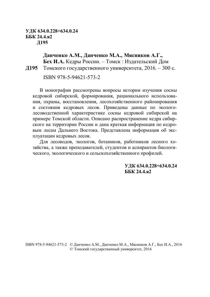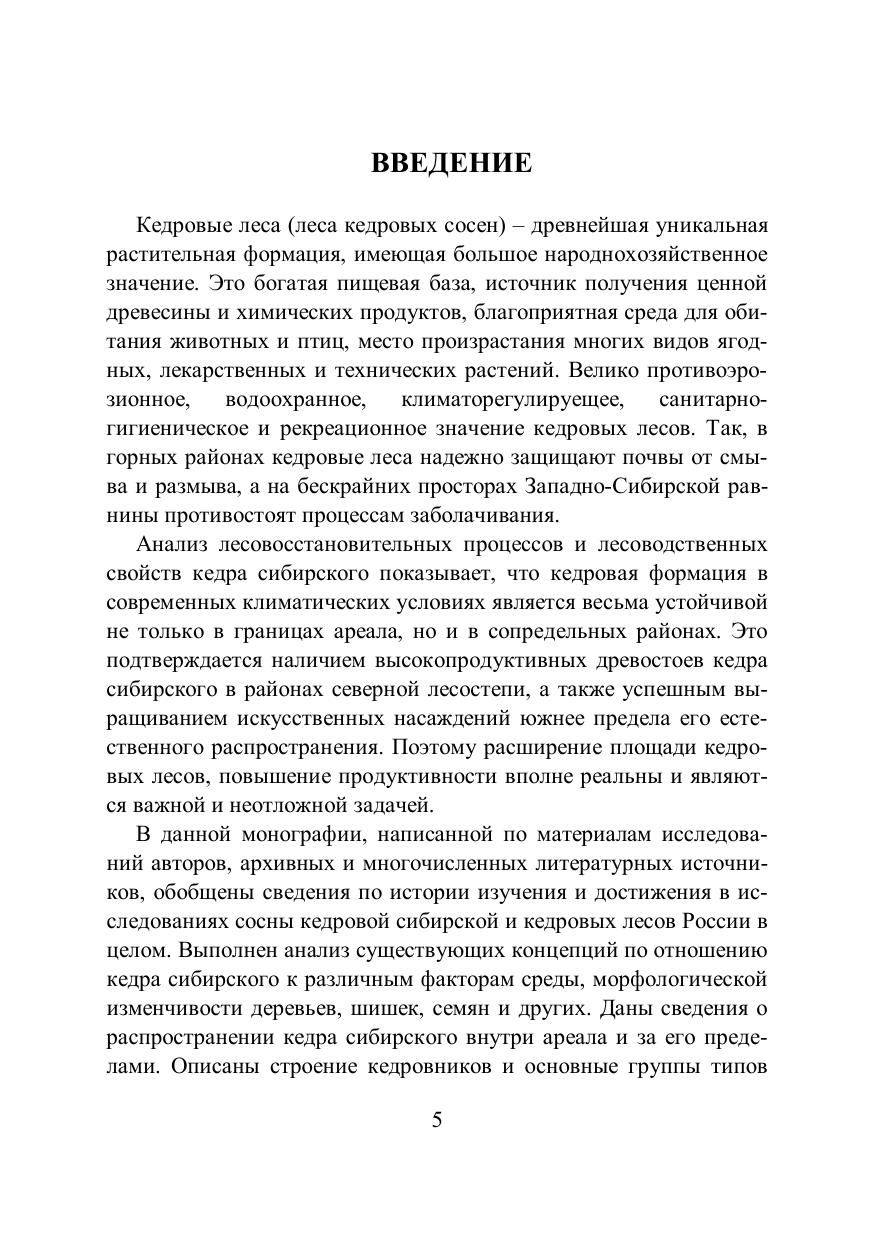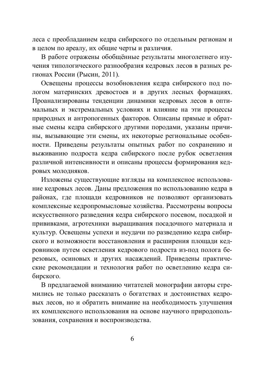 В монографии рассмотрены вопросы истории изучения сосны кедровой сибирской, формирования, рационального использования, охраны, восстановления, лесохозяйственного районирования и состояния кедровых лесов. Приведены данные по эколого-лесоводственной характеристике сосны кедровой сибирской на примере Томской области. Описано распространение кедра сибирского на территории России и дана краткая информация по кедровым лесам Дальнего Востока. Представлена информация об эксплуатации кедровых лесов. Для лесоводов, экологов, ботаников, работников лесного хозяйства, а также преподавателей, студентов и аспирантов биологического, экологического и сельскохозяйственного профилей.
