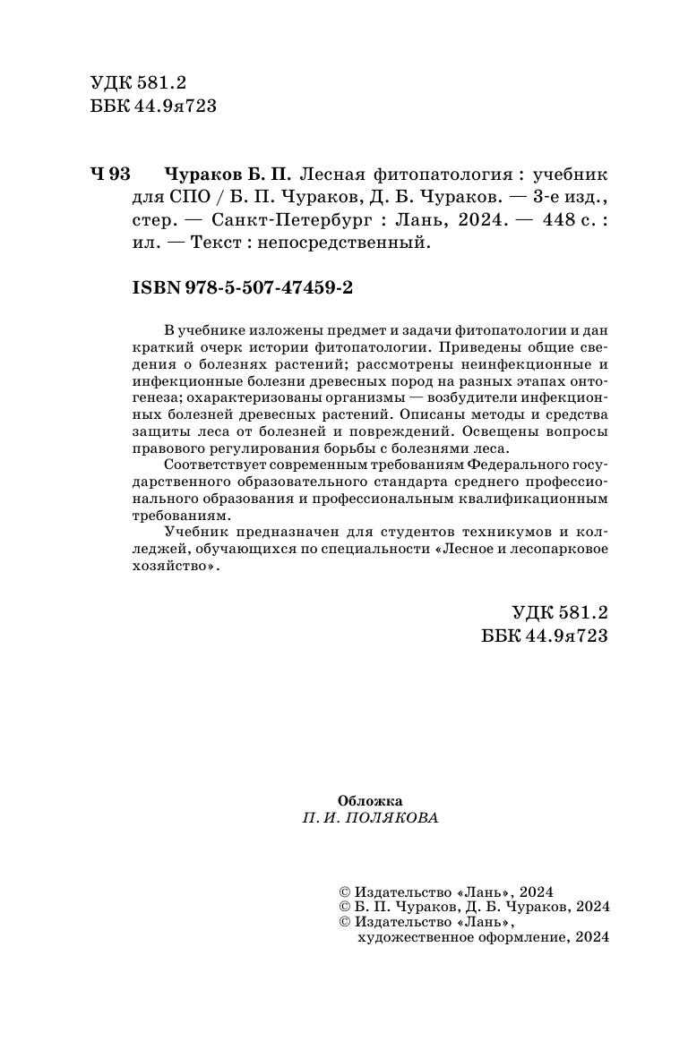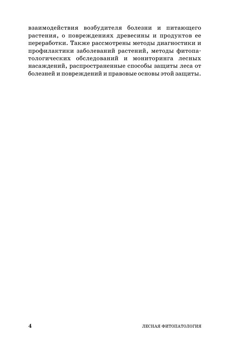 В учебнике изложены предмет и задачи фитопатологии и дан краткий очерк истории фитопатологии. Приведены общие сведения о болезнях растений, рассмотрены неинфекционные и инфекционные болезни древесных пород на разных этапах онтогенеза, охарактеризованы организмы — возбудители инфекционных болезней древесных растений. Описаны методы и средства защиты леса от болезней и повреждений. Освещены вопросы правового регулирования борьбы с болезнями леса. Соответствует современным требованиям Федерального государственного образовательного стандарта среднего профессионального образования и профессиональным квалификационным требованиям. Учебник предназначен для студентов техникумов и колледжей, обучающихся по специальности «Лесное и лесопарковое хозяйство».