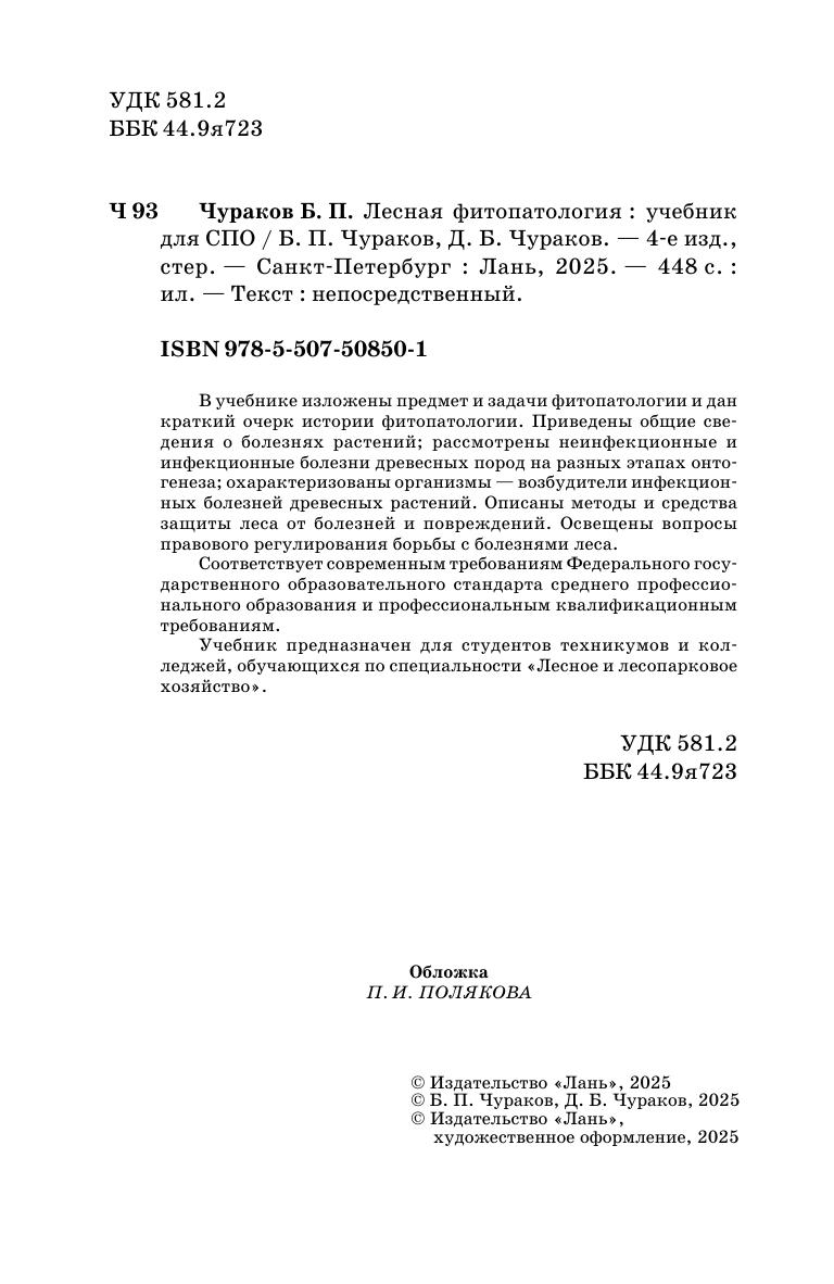 В учебнике изложены предмет и задачи фитопатологии и дан краткий очерк истории фитопатологии. Приведены общие сведения о болезнях растений, рассмотрены неинфекционные и инфекционные болезни древесных пород на разных этапах онтогенеза, охарактеризованы организмы — возбудители инфекционных болезней древесных растений. Описаны методы и средства защиты леса от болезней и повреждений. Освещены вопросы правового регулирования борьбы с болезнями леса. Соответствует современным требованиям Федерального государственного образовательного стандарта среднего профессионального образования и профессиональным квалификационным требованиям. Учебник предназначен для студентов техникумов и колледжей, обучающихся по специальности «Лесное и лесопарковое хозяйство».