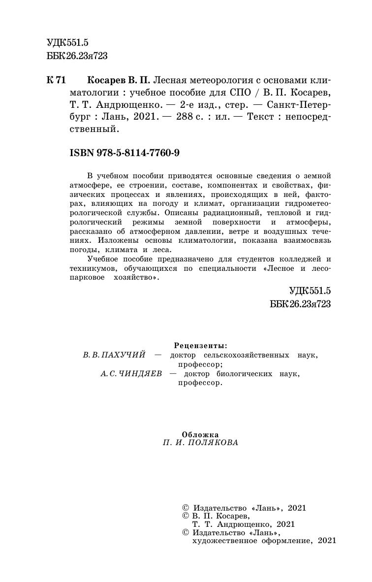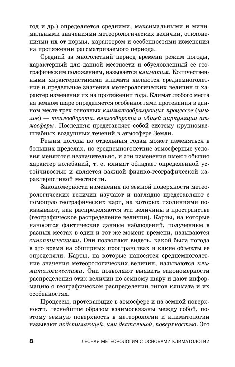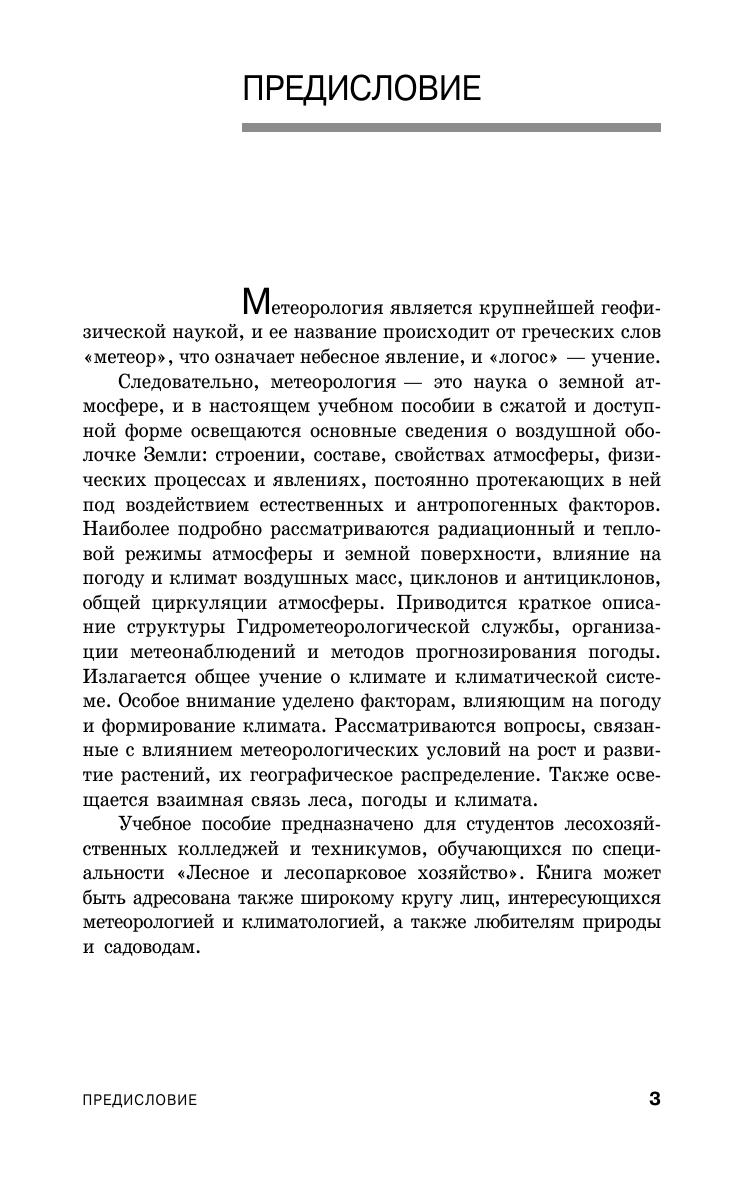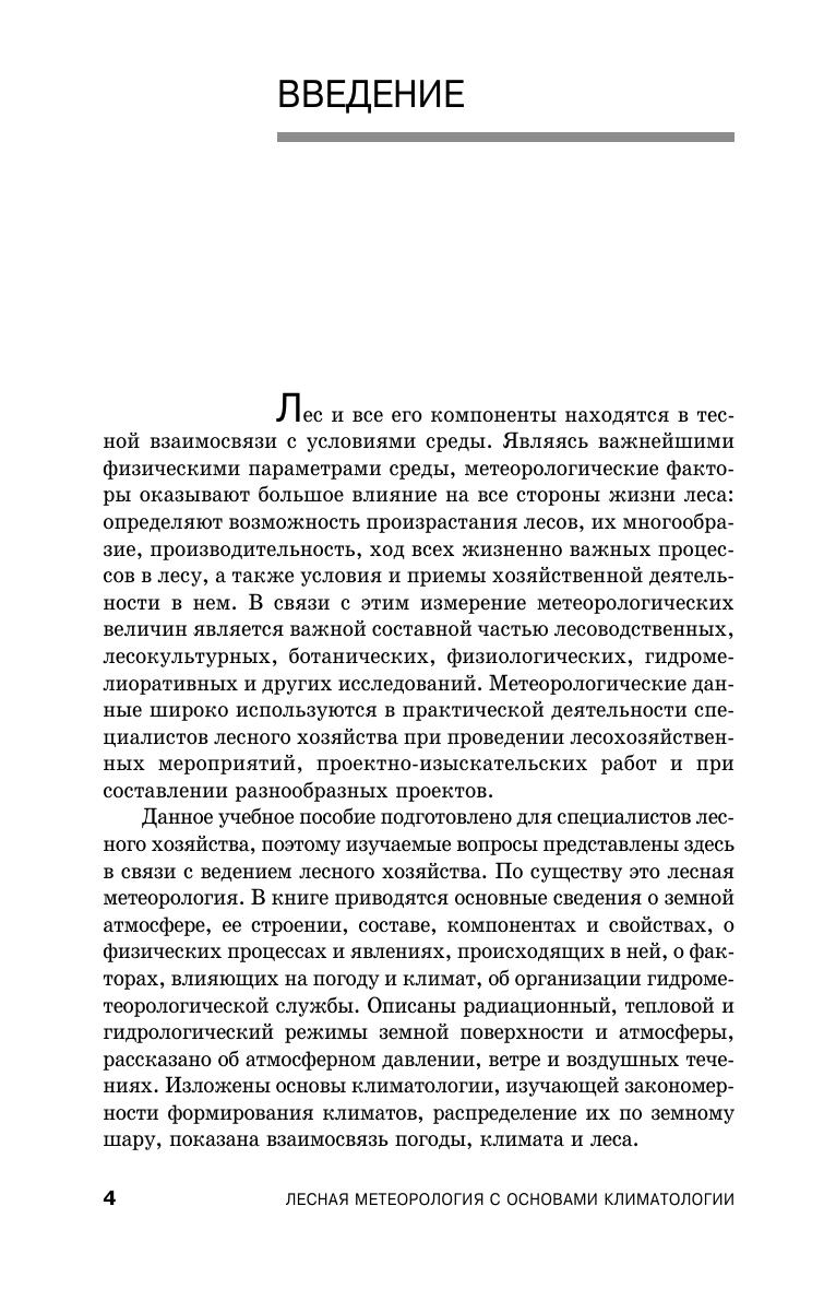 В учебном пособии приводятся основные сведения о земной атмосфере, ее строении, составе, компонентах и свойствах, о физических процессах и явлениях, происходящих в ней, о факторах, влияющих на погоду и климат, об организации гидрометеорологической службы. Описаны радиационный, тепловой и гидрологический режимы земной поверхности и атмосферы, рассказано об атмосферном давлении, ветре и воздушных течениях. Изложены основы климатологии, показана взаимосвязь погоды, климата и леса. Учебное пособие предназначено для студентов колледжей и техникумов, обучающихся по специальности «Лесное и лесопарковое хозяйство».