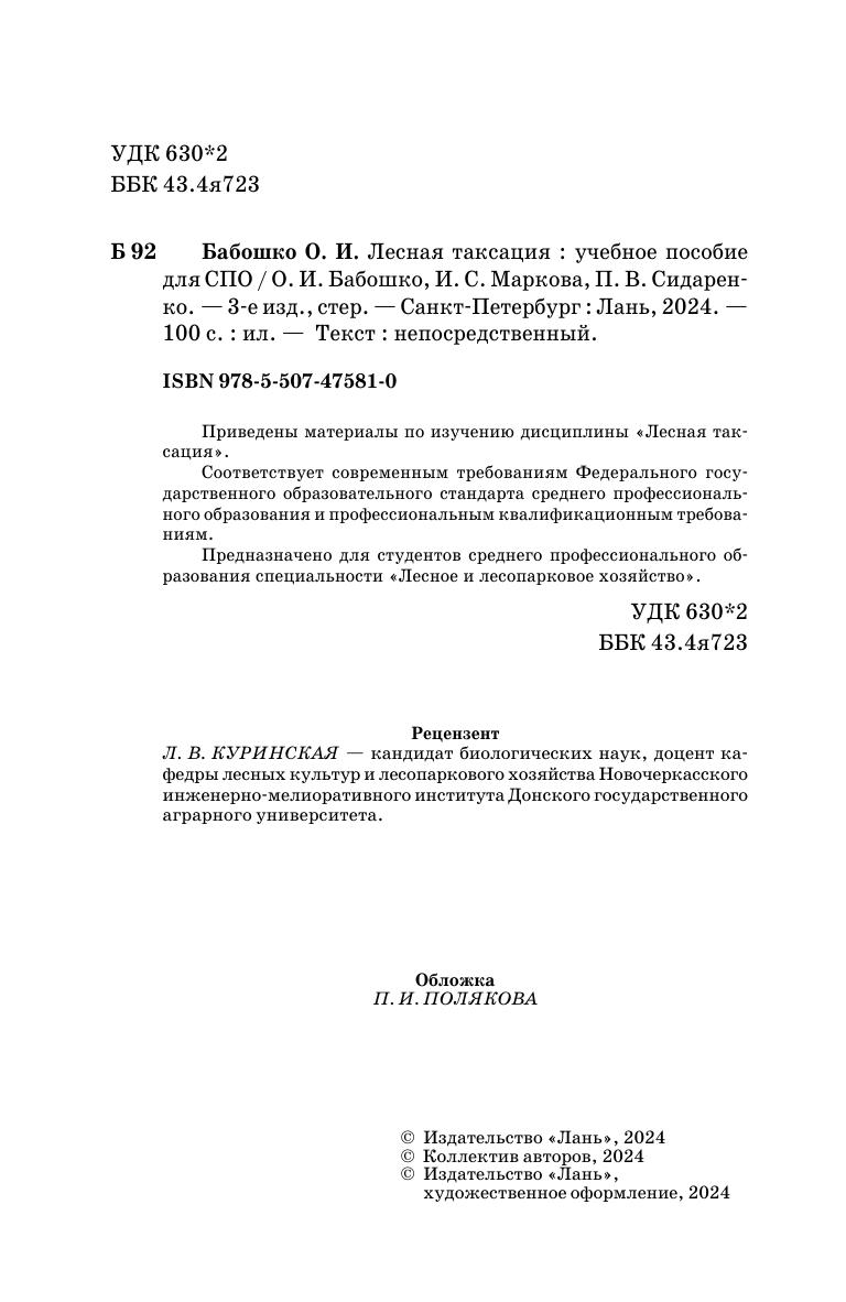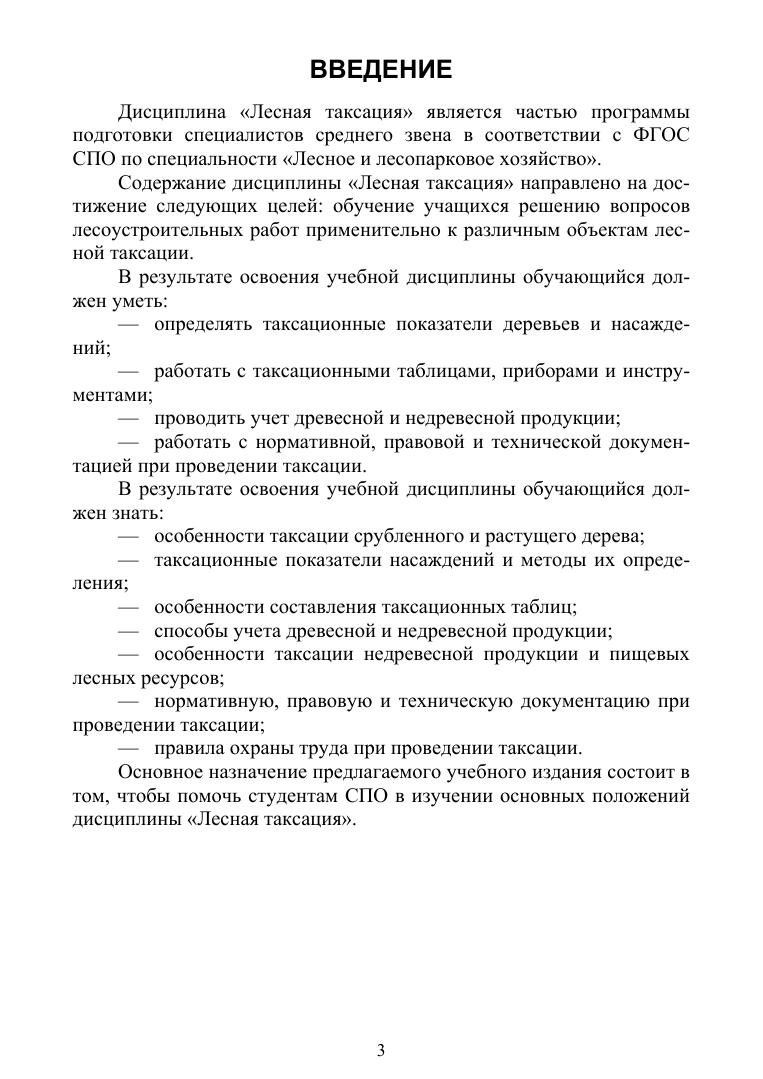 Приведены материалы по изучению дисциплины «Лесная таксация». Соответствует современным требованиям Федерального государственного образовательного стандарта среднего профессионального образования и профессиональным квалификационным требованиям. Предназначено для студентов среднего профессионального образования специальности «Лесное и лесопарковое хозяйство».