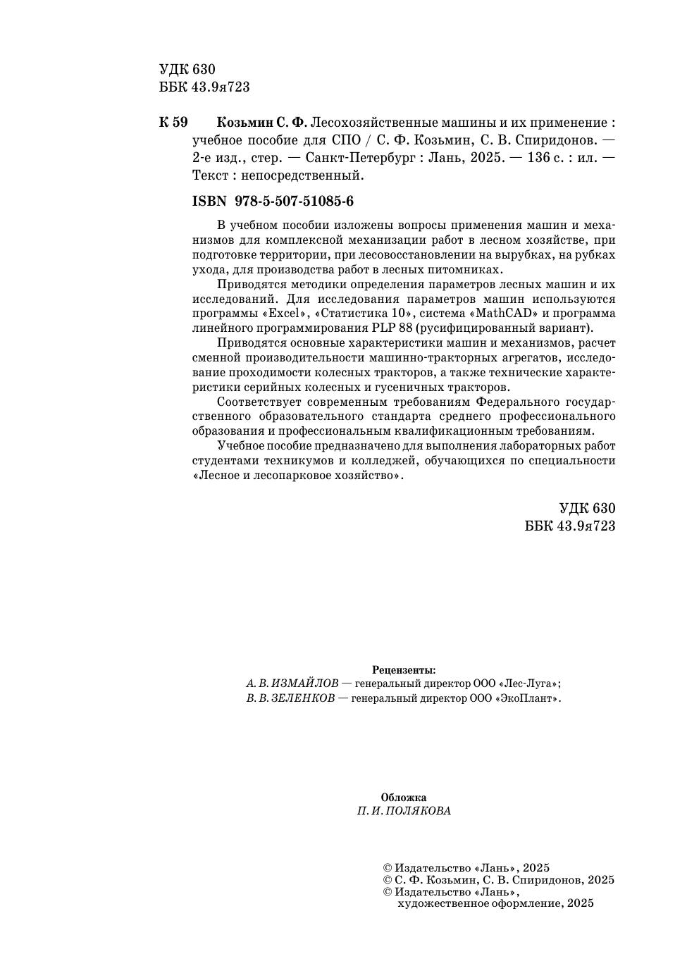 В учебном пособии изложены вопросы применения машин и механизмов для комплексной механизации работ в лесном хозяйстве, при подготовке территории, при лесовосстановлении на вырубках, на рубках ухода, для производства работ в лесных питомниках. Приводятся методики определения параметров лесных машин и их исследований. Для исследования параметров машин используются программы «Excel», «Статистика 10», система «MathCAD» и программа линейного программирования PLP 88 (русифицированный вариант). Приводятся основные характеристики машин и механизмов, расчет сменной производительности машинно-тракторных агрегатов, исследование проходимости колесных тракторов, а также технические характеристики серийных колесных и гусеничных тракторов. Соответствует современным требованиям Федерального государственного образовательного стандарта среднего профессионального образования и профессиональным квалификационным требованиям. Учебное пособие предназначено для выполнения лабораторных работ студентами техникумов и колледжей, обучающихся по специальности «Лесное и лесопарковое хозяйство».