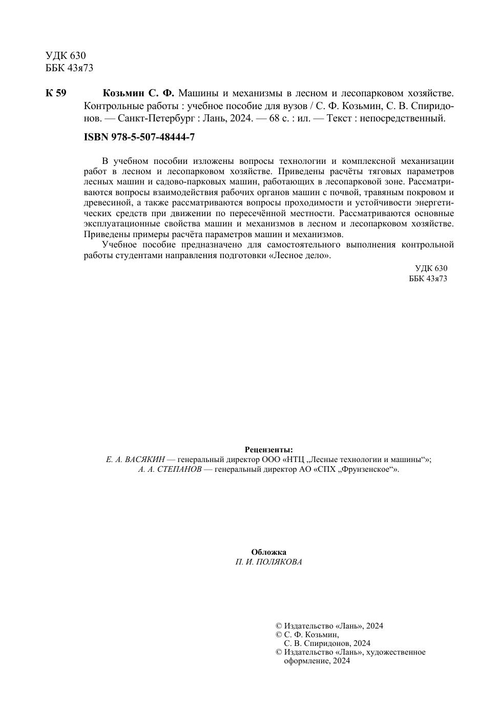 В учебном пособии изложены вопросы технологии и комплексной механизации работ в лесном и лесопарковом хозяйстве. Приведены расчёты тяговых параметров лесных машин и садово-парковых машин, работающих в лесопарковой зоне. Рассматри-ваются вопросы взаимодействия рабочих органов машин с почвой, травяным покровом и древесиной, а также рассматриваются вопросы проходимости и устойчивости энергетических средств при движении по пересечённой местности. Рассматриваются основные эксплуатационные свойства машин и механизмов в лесном и лесопарковом хозяйстве. Приведены примеры расчёта параметров машин и механизмов. Учебное пособие предназначено для самостоятельного выполнения контрольной работы студентами направления подготовки «Лесное дело».