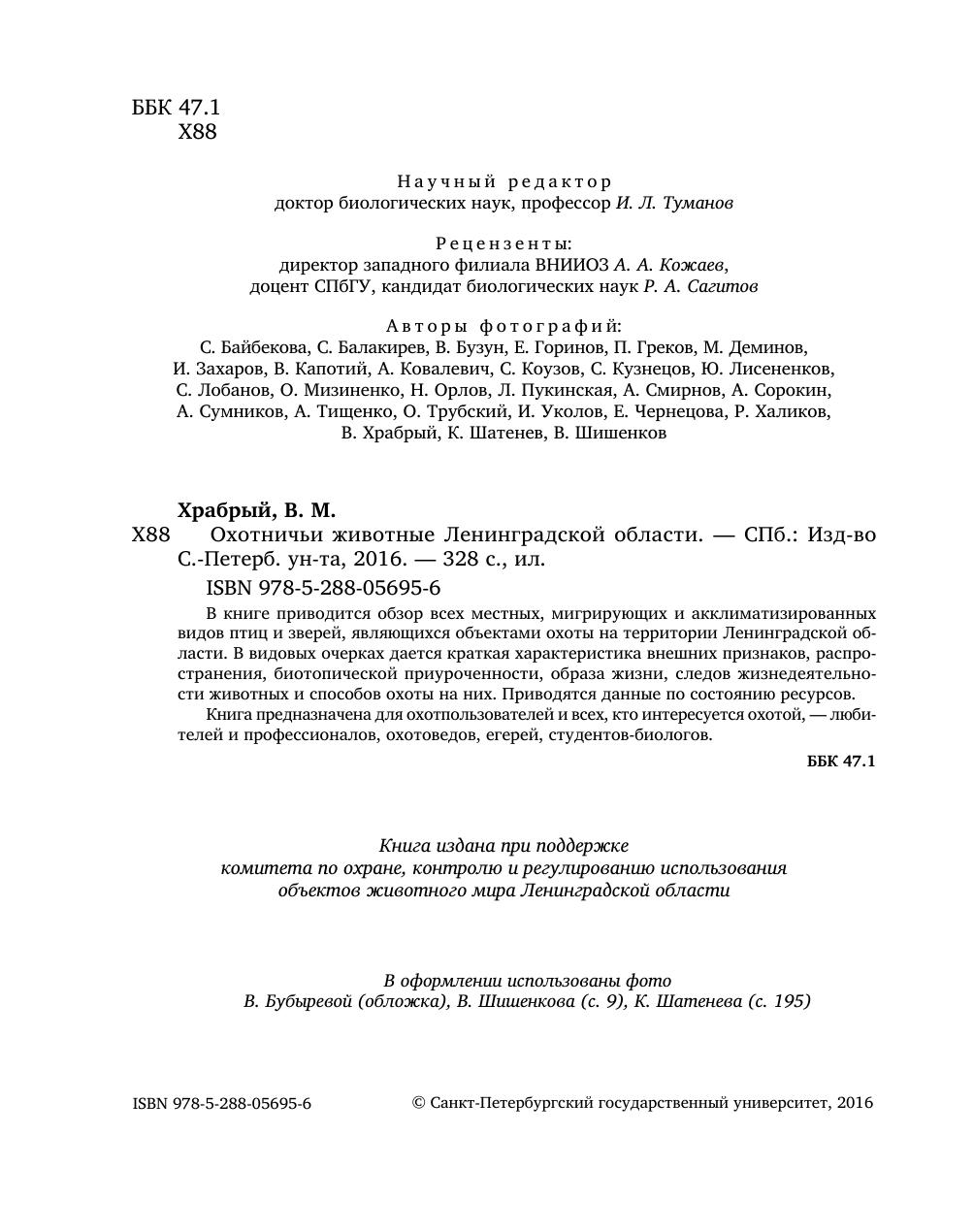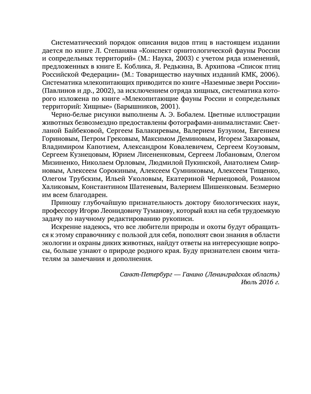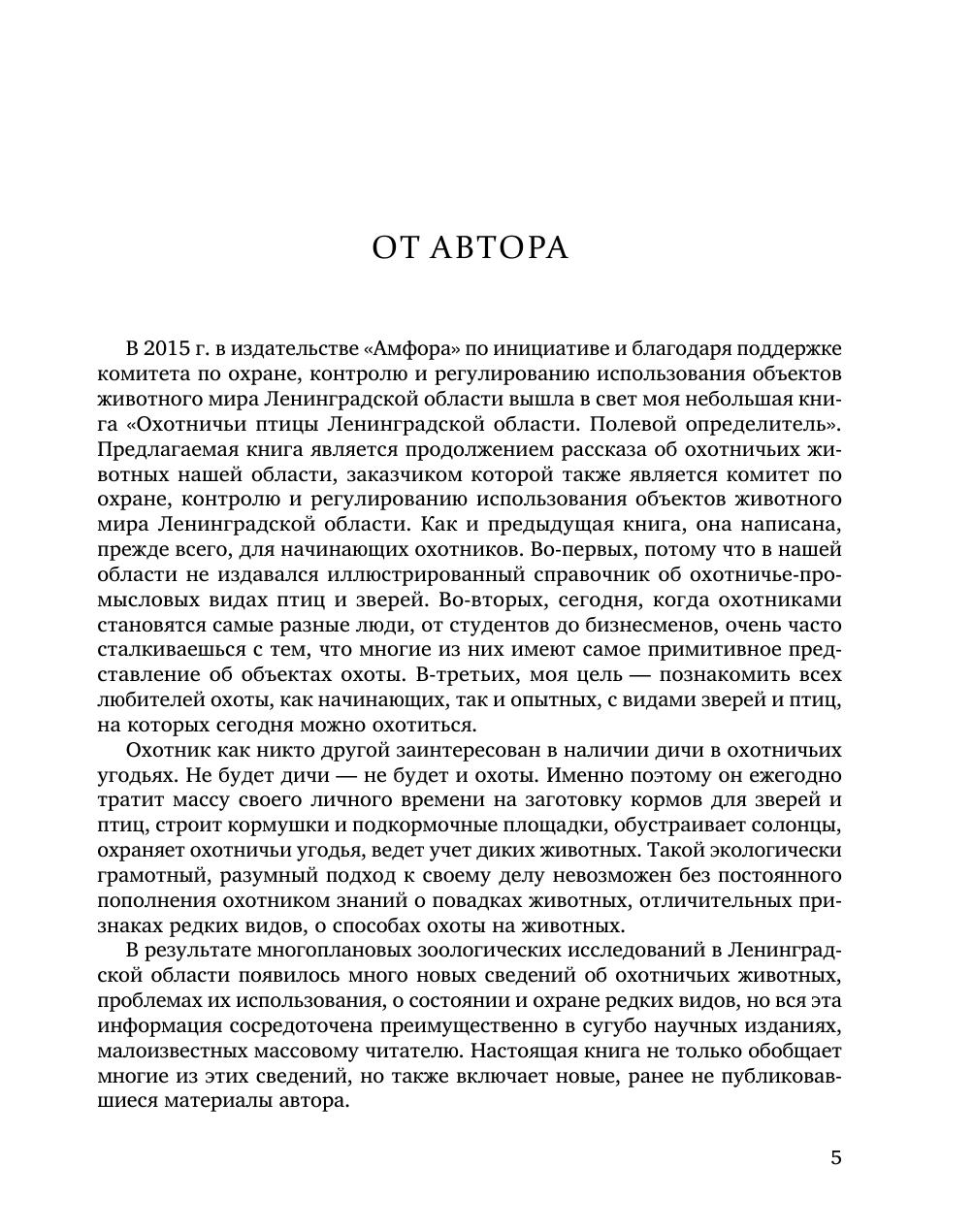 В книге приводится обзор всех местных, мигрирующих и акклиматизированных видов птиц и зверей, являющихся объектами охоты на территории Ленинградской области. В видовых очерках дается краткая характеристика внешних признаков, распро-