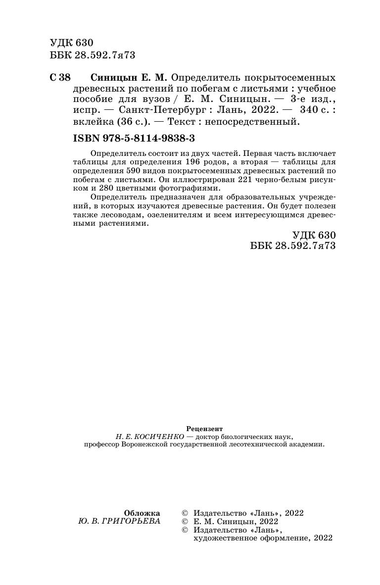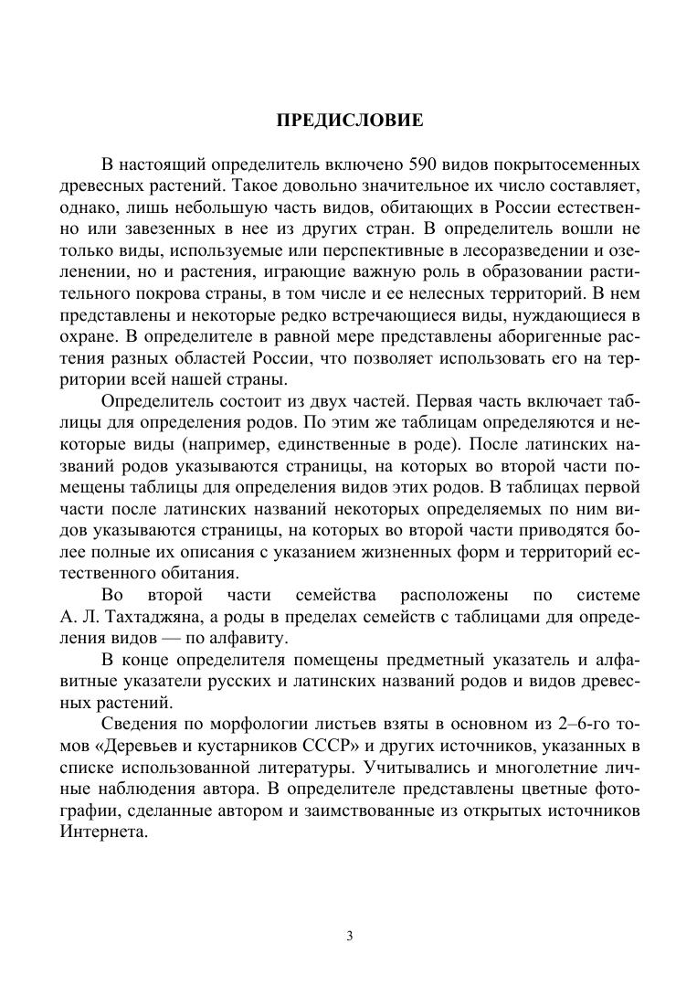 Определитель состоит из двух частей. Первая часть включает таблицы для определения 196 родов, а вторая — таблицы для определения 590 видов покрытосеменных древесных растений по побегам с листьями. Он иллюстриован 221 черно-белым рисунком и 280 цветными фотографиями. Определитель предназначен для образовательных учреждений, в которых изучаются древесные растения. Он будет полезен также лесоводам, озеленителям и всем интересующимся древесными растениями.