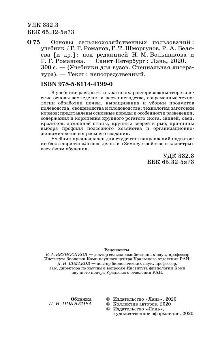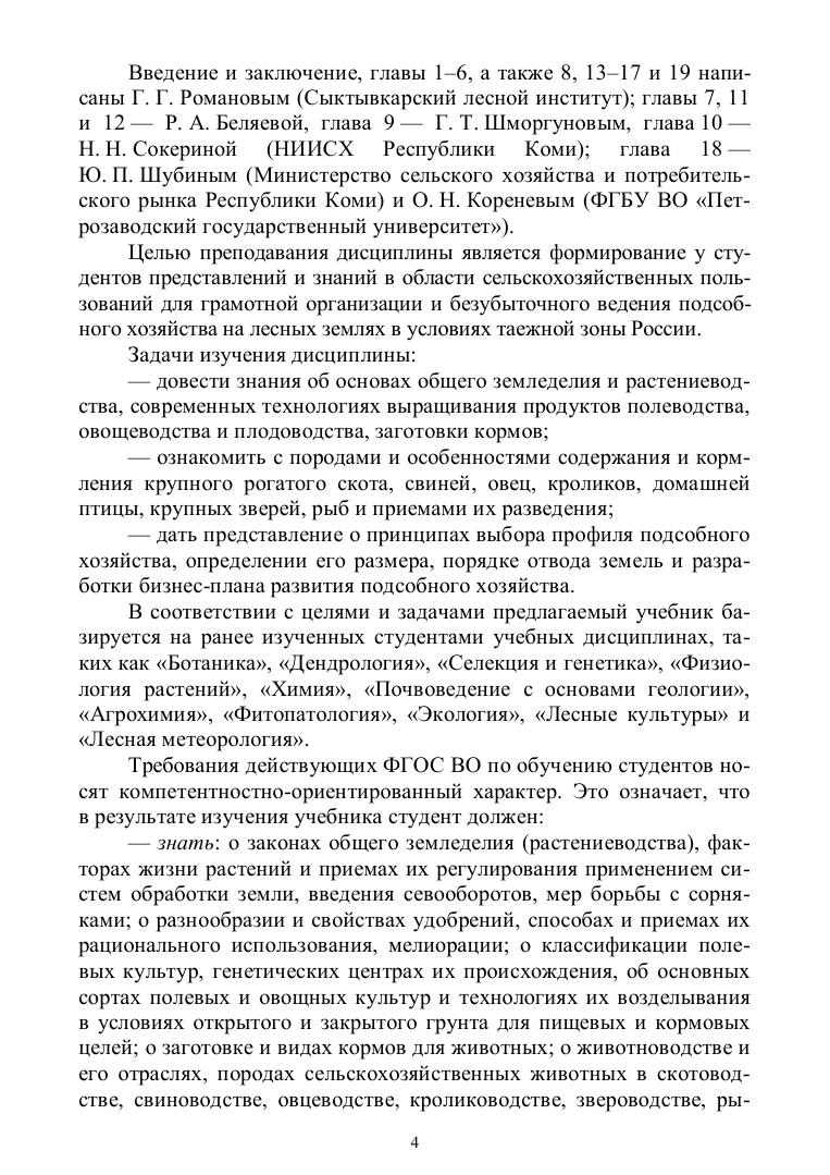 В учебнике раскрыты и кратко охарактеризованы теоретические основы земледелия и растениеводства, современные технологии обработки почвы, выращивания и уборки продуктов полеводства, овощеводства и плодоводства; технология заготовки кормов; представлены основные породы и особенности разведения, содержания и кормления крупного рогатого скота, свиней, овец, кроликов, домашней птицы, крупных зверей и рыб; принципы выбора профиля подсобного хозяйства и организационно-экономические вопросы его создания. В конце каждой главы помещены вопросы для самоконтроля, тестовые задания и ситуационные задачи. Предназначено для студентов направлений подготовки бакалавриата «Лесное дело» и «Землеустройство и кадастры» всех форм обучения.