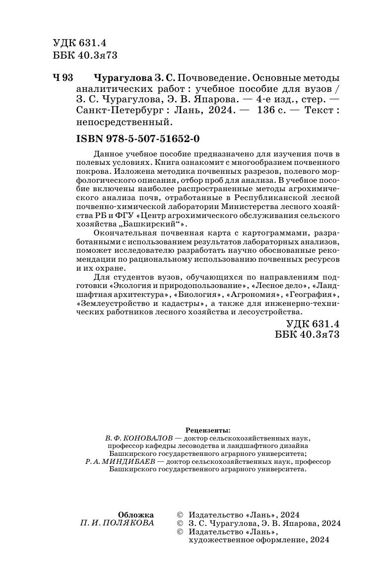 Данное учебное пособие предназначено для изучения почв в полевых условиях. Книга ознакомит c многообразием почвенного покрова. Изложена методика почвенных разрезов, полевого морфологического описания, отбор проб для анализа. В учебное пособие включены наиболее распространенные методы агрохимического анализа почв, отработанные в Республиканской лесной почвенно-химической лаборатории Министерства лесного хозяйства РБ и ФГУ «Центр агрохимического обслуживания сельского хозяйства «Башкирский». Окончательная почвенная карта с картограммами, разработанные с использованием результатов лабораторных анализов поможет исследователю разработать научно обоснованные рекомендации по рациональному использованию почвенных ресурсов и с их охраной. Для студентов вузов, обучающихся по направлениям подготовки «Экология и природопользование», «Лесное дело», «Ландшафтная архитектура, «Биология», «Агрономия, «География», «Землеутройство и кадастры», а также для инженерно-технических работников лесного хозяйства и лесоустройства.