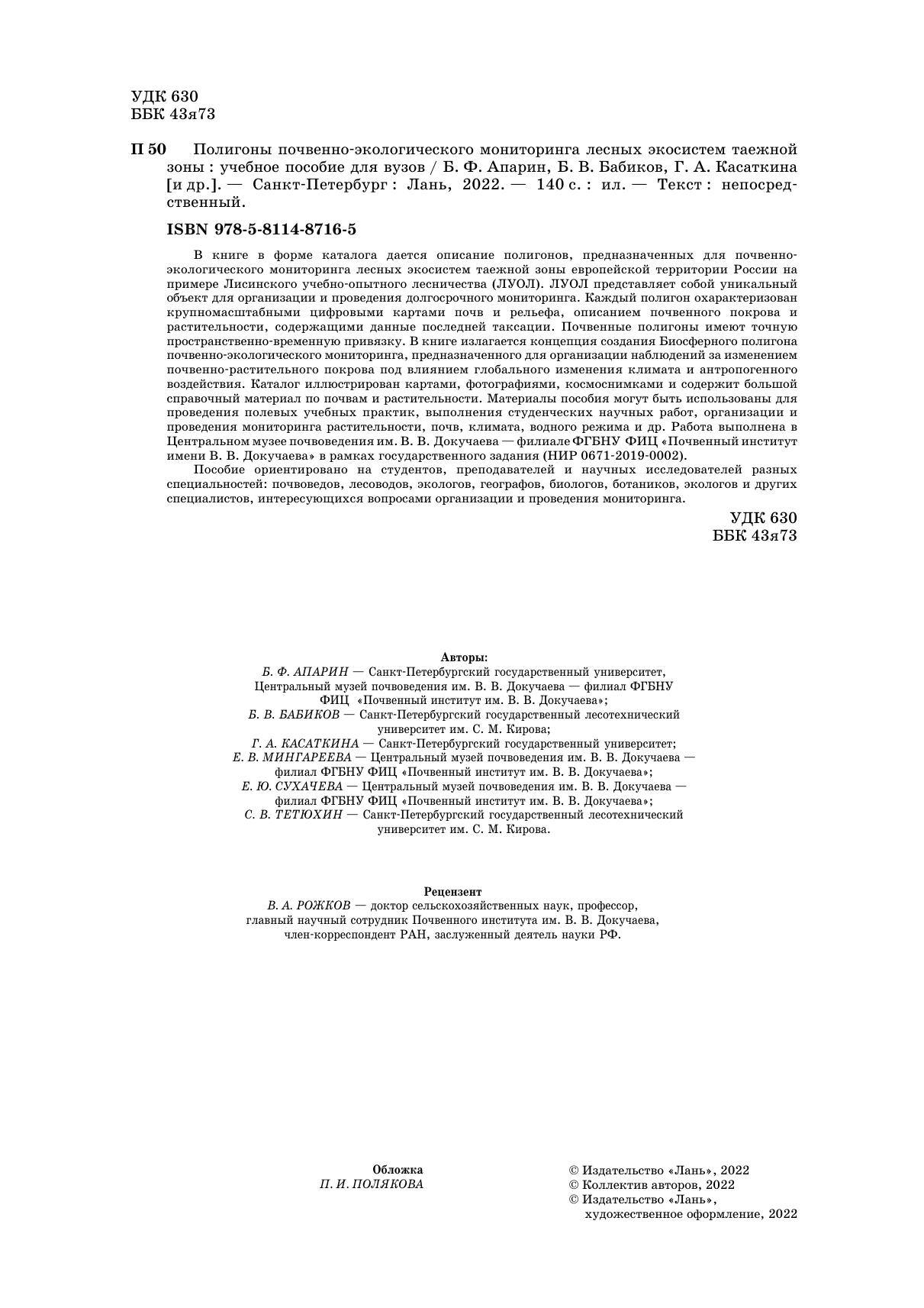 В книге в форме каталога дается описание полигонов, предназначенных для почвенно-экологического мониторинга лесных экосистем таежной зоны европейской территории России на примере Лисинского учебно-опытного лесничества (ЛУОЛ). ЛУОЛ представляет собой уникальный объект для организации и проведения долгосрочного мониторинга. Каждый полигон охарактеризован крупномасштабными цифровыми картами почв и рельефа, описанием почвенного покрова и растительности, содержащими данные последней таксации. Почвенные полигоны имеют точную пространственно-временную привязку. В книге излагается концепция создания Биосферного полигона почвенно-экологического мониторинга, предназначенного для организации наблюдений за изменением почвенно-растительного покрова под влиянием глобального изменения климата и антропогенного воздействия. Каталог иллюстрирован картами, фотографиями, космоснимками и содержит большой справочный материал по почвам и растительности. Материалы пособия могут быть использованы для проведения полевых учебных практик, выполнения студенческих научных работ, организации и проведения мониторинга растительности, почв, климата, водного режима и др.