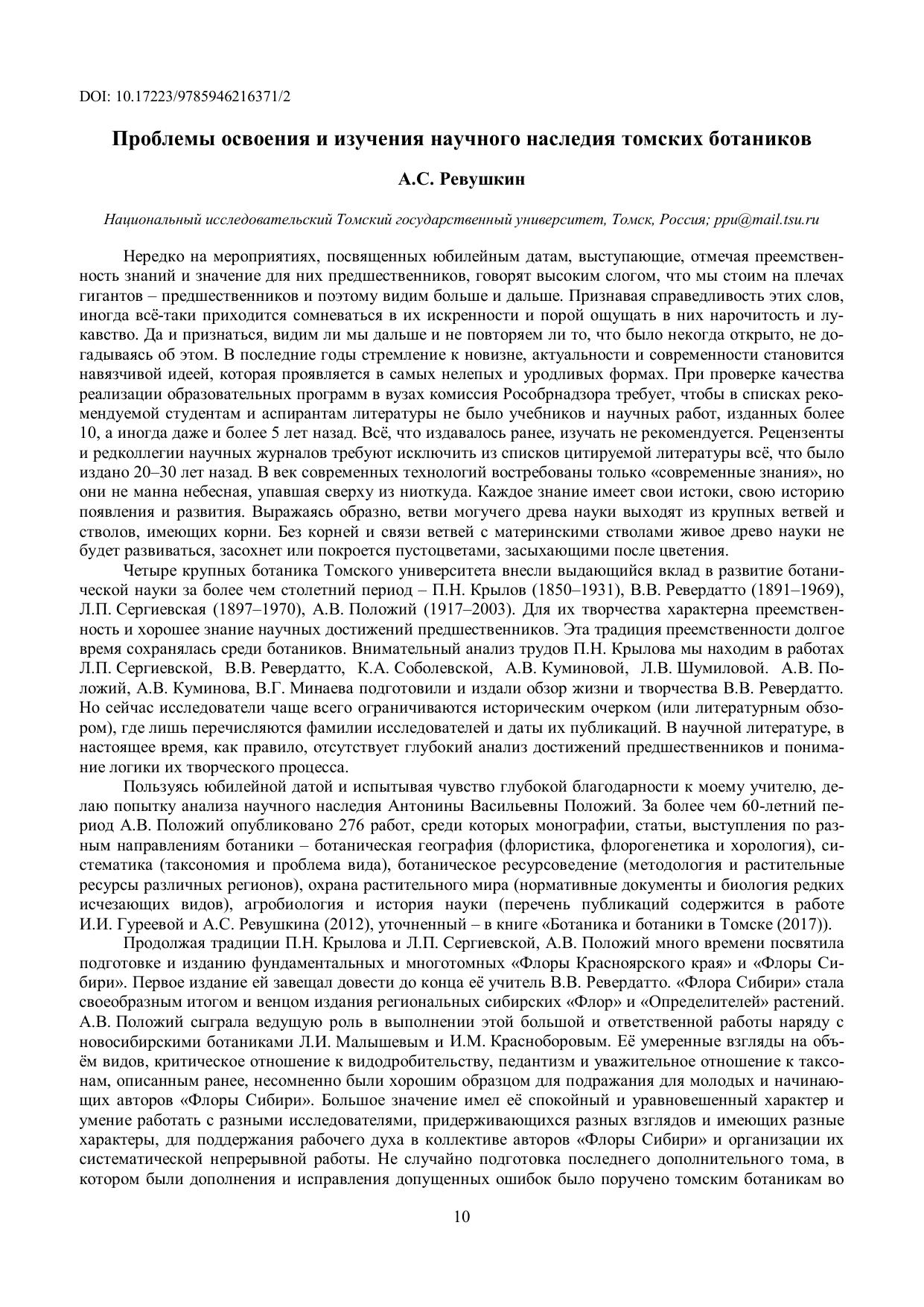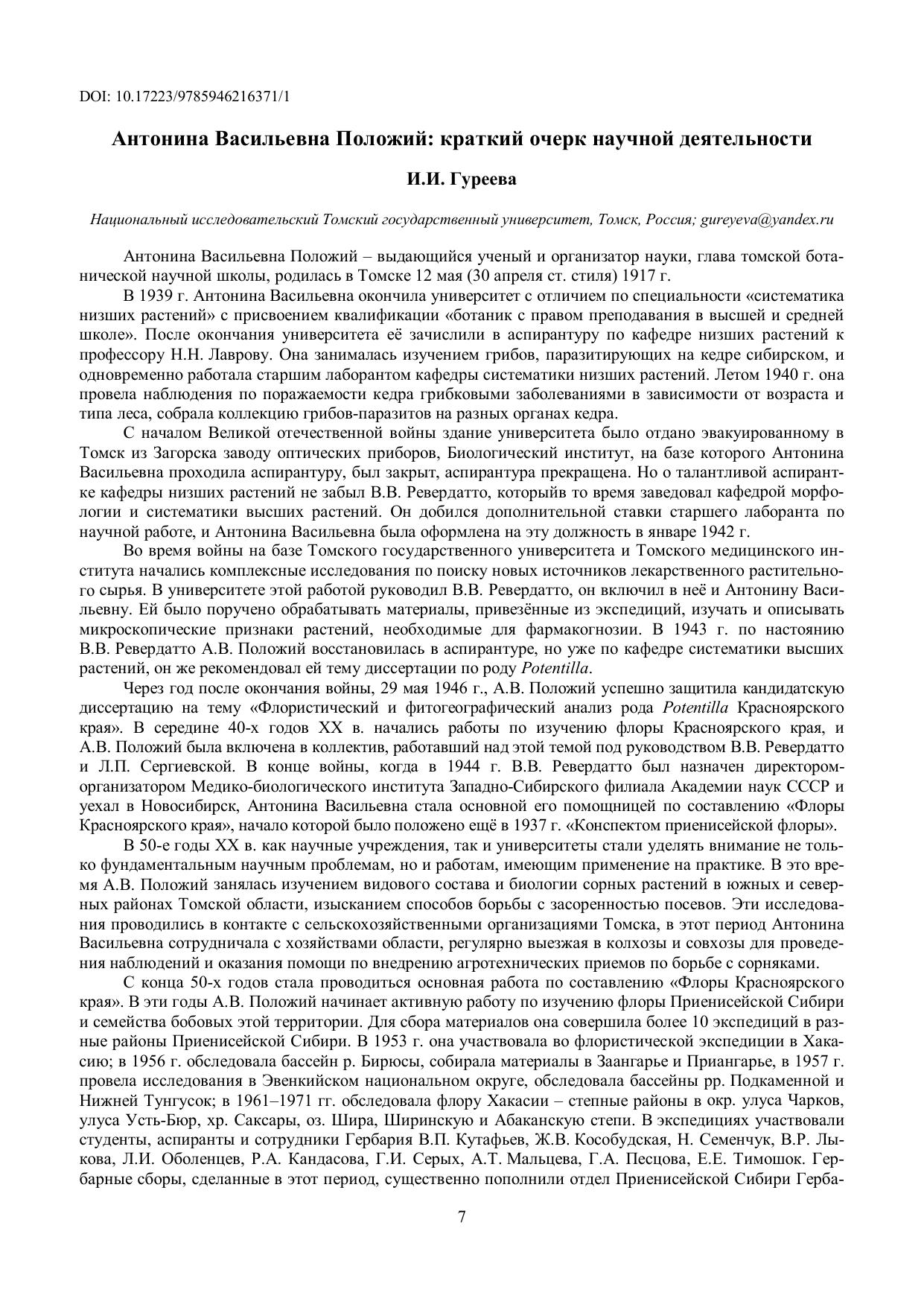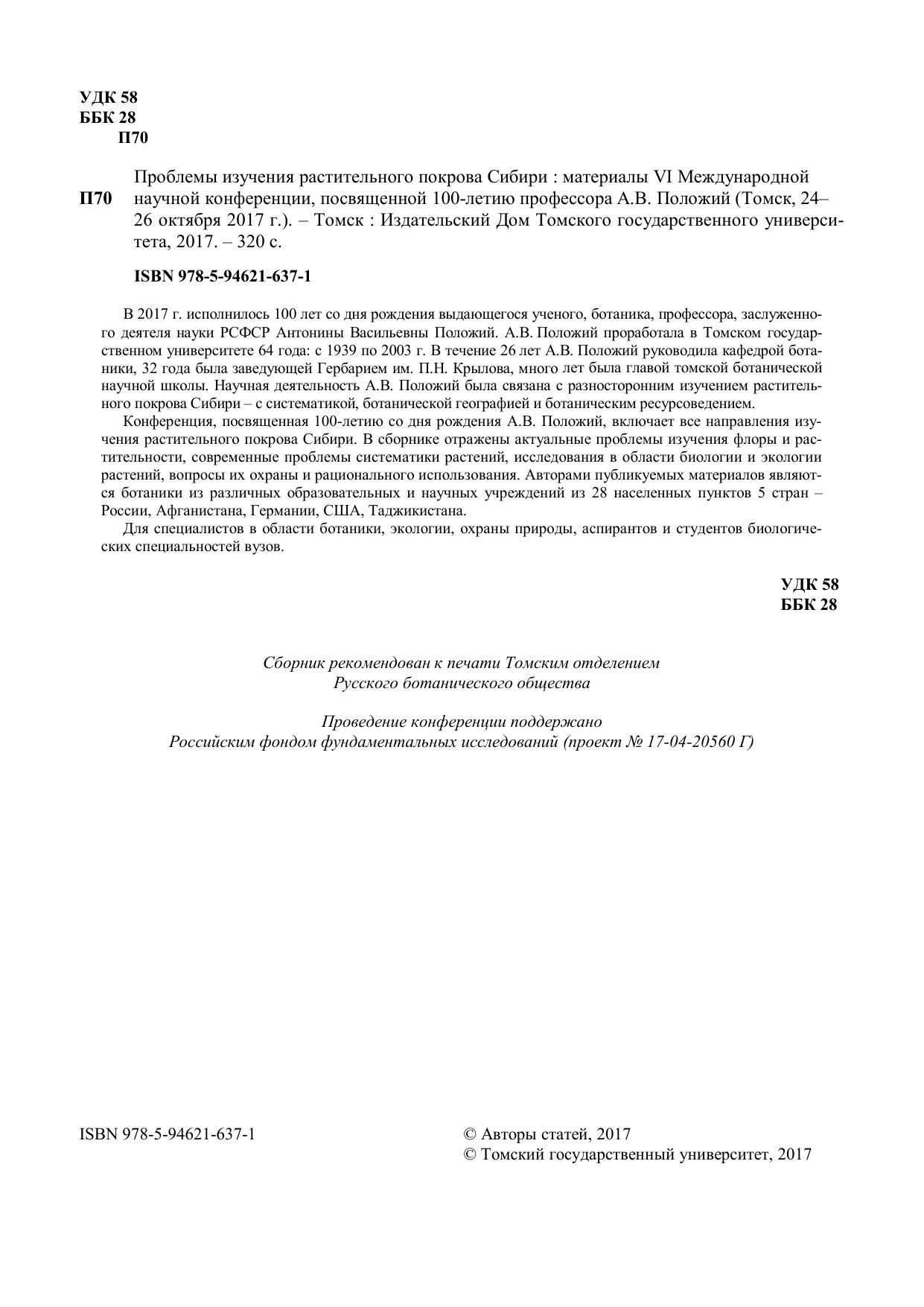 В 2017 г. исполнилось 100 лет со дня рождения выдающегося ученого, ботаника, профессора, заслуженного деятеля науки РСФСР Антонины Васильевны Положий. А.В. Положий проработала в Томском государственном университете 64 года: с 1939 по 2003 г. В течение 26 лет А.В. Положий руководила кафедрой ботаники, 32 года была заведующей Гербарием им. П.Н. Крылова, много лет была главой томской ботанической научной школы. Научная деятельность А.В. Положий была связана с разносторонним изучением растительного покрова Сибири – с систематикой, ботанической географией и ботаническим ресурсоведением. Конференция, посвященная 100-летию со дня рождения А.В. Положий, включает все направления изучения растительного покрова Сибири. В сборнике отражены актуальные проблемы изучения флоры и растительности, современные проблемы систематики растений, исследования в области биологии и экологии растений, вопросы их охраны и рационального использования. Авторами публикуемых материалов являются ботаники из различных образовательных и научных учреждений из 28 населенных пунктов 5 стран – России, Афганистана, Германии, США, Таджикистана. Для специалистов в области ботаники, экологии, охраны природы, аспирантов и студентов биологических специальностей вузов.