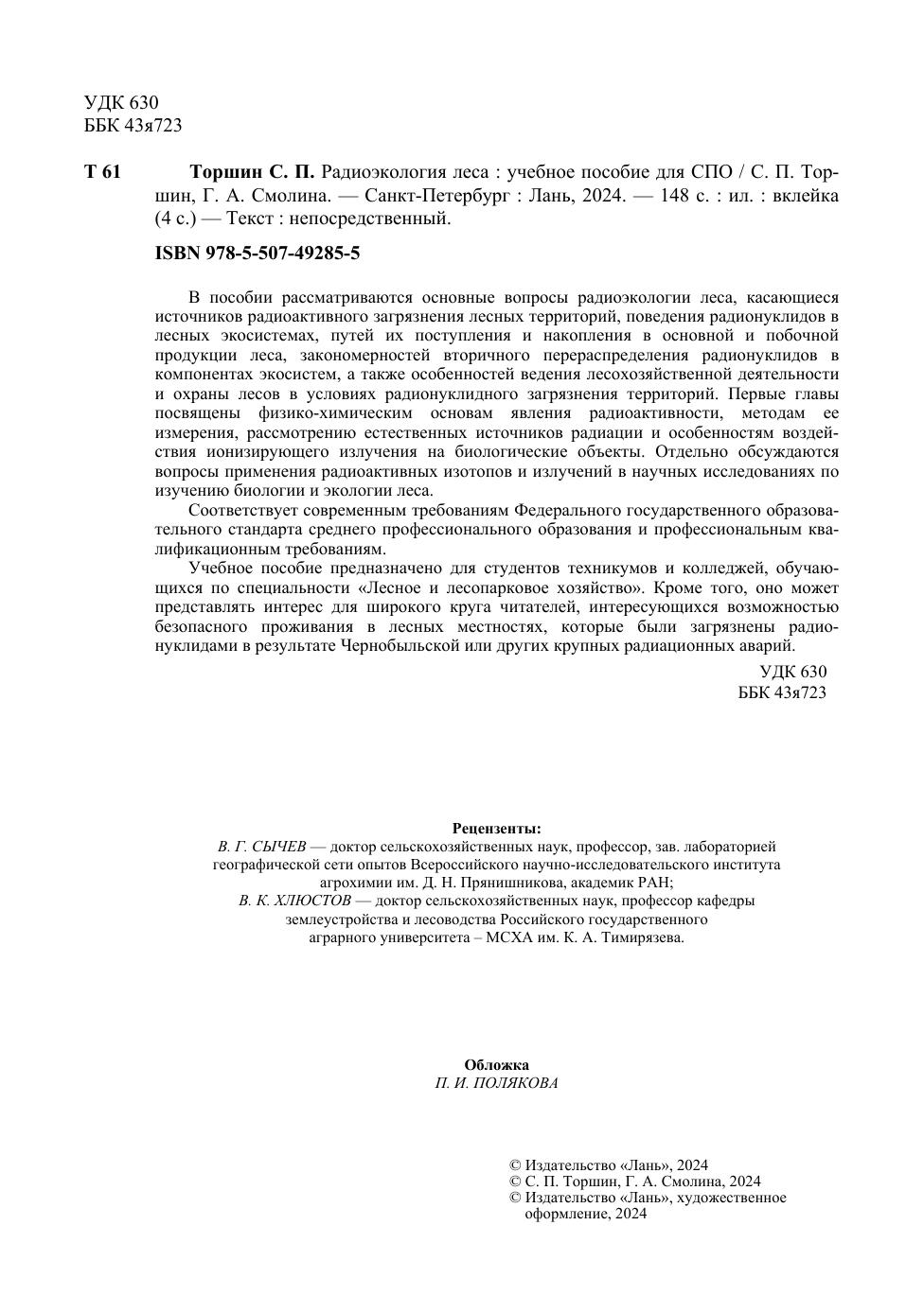 В пособии рассматриваются основные вопросы радиоэкологии леса, касающиеся источников радиоактивного загрязнения лесных территорий, поведения радионуклидов в лесных экосистемах, путей их поступления и накопления в основной и побочной продукции леса, закономерностей вторичного перераспределения радионуклидов в компонентах экосистем, а также особенностей ведения лесохозяйственной деятельности и охраны лесов в условиях радионуклидного загрязнения территорий. Первые главы посвящены физико-химическим основам явления радиоактивности, методам ее измерения, рассмотрению естественных источников радиации и особенностям воздействия ионизирующего излучения на биологические объекты. Отдельно обсуждаются вопросы применения радиоактивных изотопов и излучений в научных исследованиях по изучению биологии и экологии леса. Соответствует современным требованиям Федерального государственного образовательного стандарта среднего профессионального образования и профессиональным квалификационным требованиям. Учебное пособие предназначено для студентов техникумов и колледжей, обучающихся по специальности «Лесное и лесопарковое хозяйство». Кроме того, оно может представлять интерес для широкого круга читателей, интересующихся возможностью безопасного проживания в лесных местностях, которые были загрязнены радионуклидами в результате Чернобыльской или других крупных радиационных аварий.