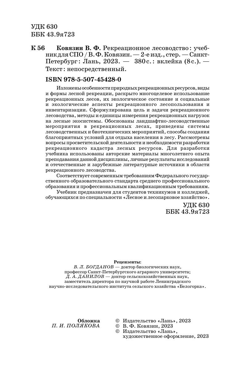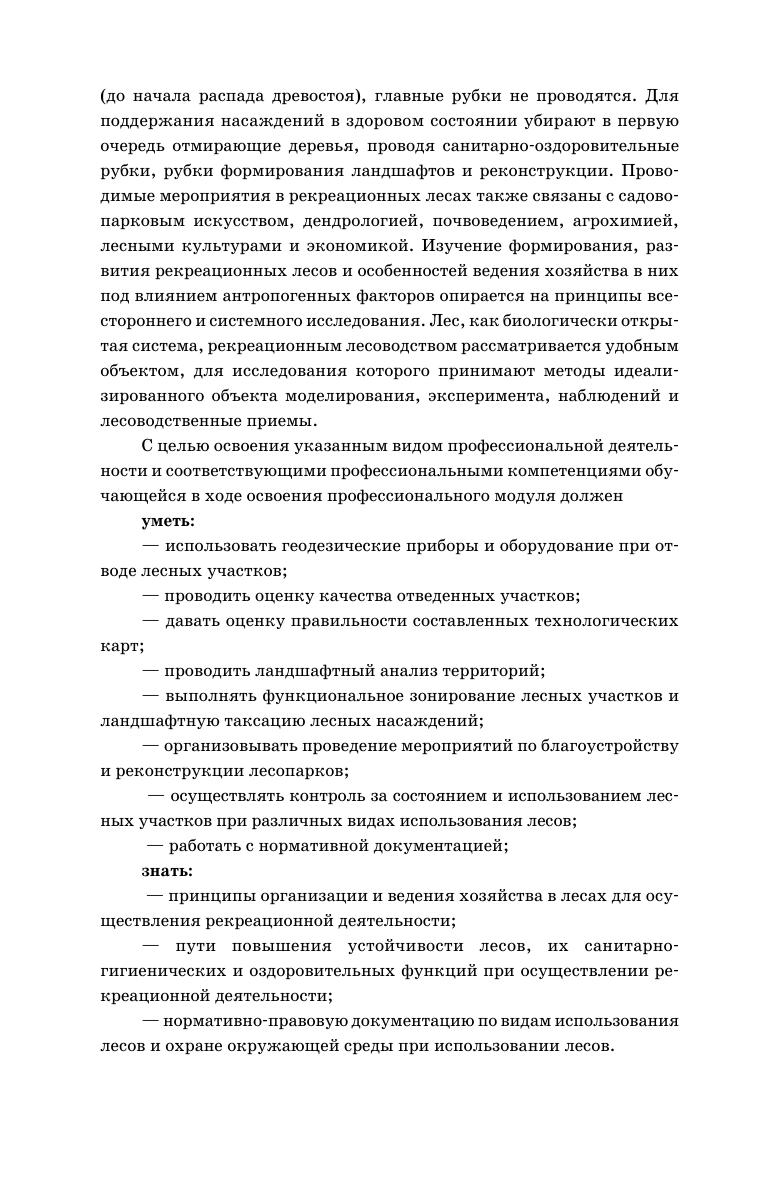 Изложены особенности природных рекреационных ресурсов, виды и формы лесной рекреации, раскрыто многоцелевое использование рекреационных лесов, их экологическое состояние и социальные и экологические аспекты рекреационного лесопользования и инвентаризации. Сформулирована цель и задачи рекреационного лесоводства, методы и единицы измерения рекреационных нагрузок на лесные экосистемы. Обоснованы ландшафтно-лесоводственные мероприятия в рекреационных лесах, приведены системы лесоводственных и биотехнических мероприятий, способы создания благоприятных условий для отдыха населения в лесу. Рассмотрены вопросы просветительской деятельности и необходимости разработки рекреационного кадастра лесных ресурсов. Для разработки учебника использованы авторские материалы многолетнего опыта преподавания данной дисциплины, личные результаты исследований и отечественные и зарубежные литературные источники в области рекреационного лесоводства. Соответствует современным требованиям Федерального государственного образовательного стандарта среднего профессионального образования и профессиональным квалификационным требованиям. Учебник предназначен для студентов техникумов и колледжей, обучающихся по специальности «Лесное и лесопарковое хозяйство».