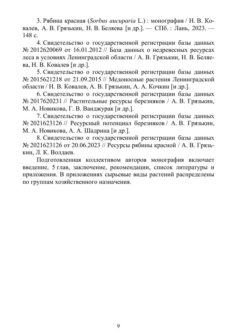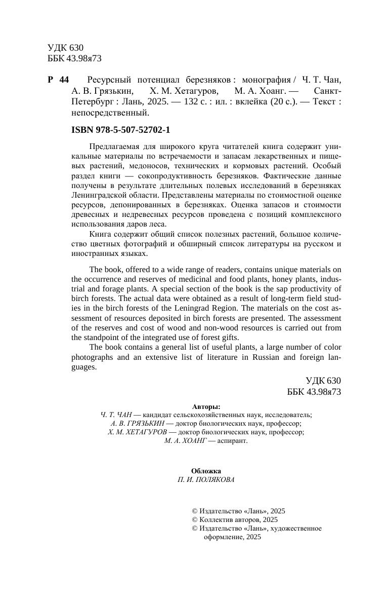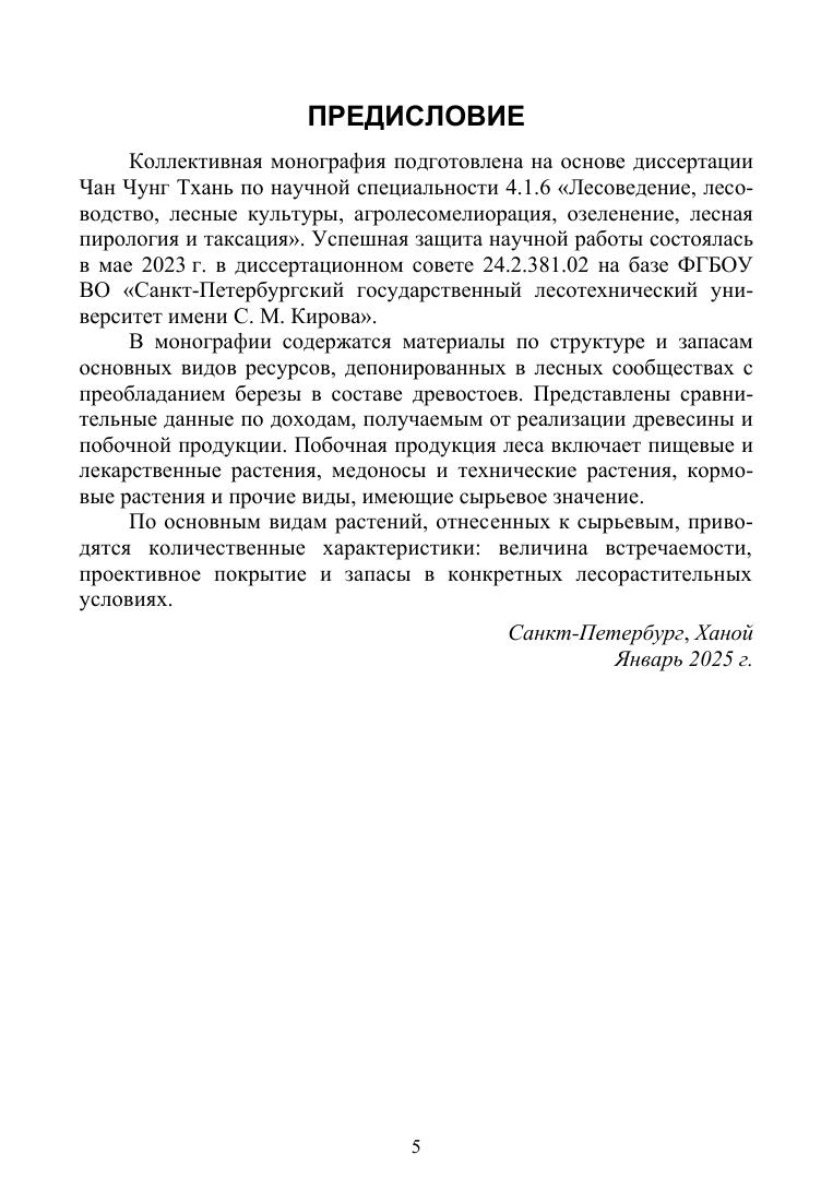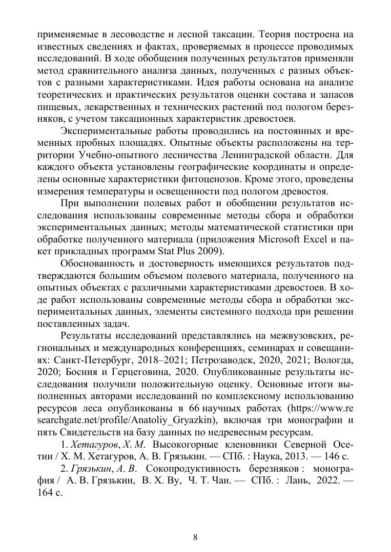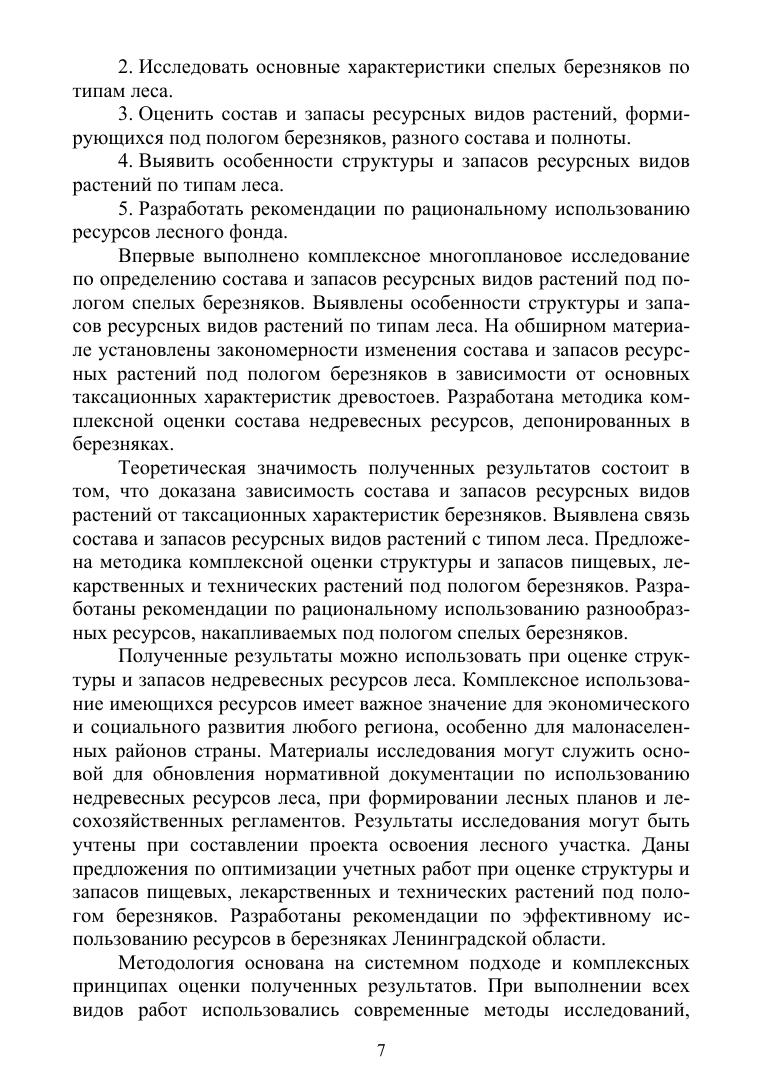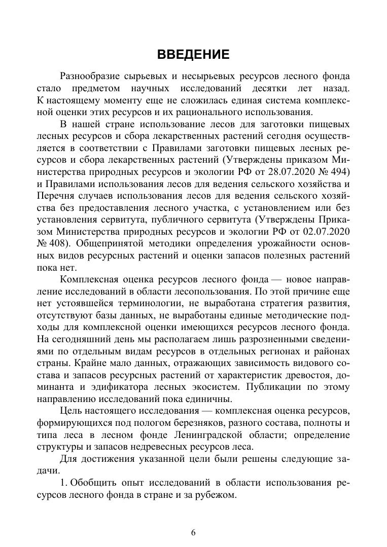 Предлагаемая для широкого круга читателей книга содержит уникальные материалы по встречаемости и запасам лекарственных и пищевых растений, медоносов, технических и кормовых растений. Особый раздел книги — сокопродуктивность березняков. Фактические данные получены в результате длительных полевых исследований в березняках Ленинградской области. Представлены материалы по стоимостной оценке ресурсов, депонированных в березняках. Оценка запасов и стоимости древесных и недревесных ресурсов проведена с позиций комплексного использования даров леса. Книга содержит общий список полезных растений, большое количество цветных фотографий и обширный список литературы на русском и иностранных языках. The book, offered to a wide range of readers, contains unique materials on the occurrence and reserves of medicinal and food plants, honey plants, industrial and forage plants. A special section of the book is the sap productivity of birch forests. The actual data were obtained as a result of long-term field studies in the birch forests of the Leningrad Region. The materials on the cost assessment of resources deposited in birch forests are presented. The assessment of the reserves and cost of wood and non-wood resources is carried out from the standpoint of the integrated use of forest gifts. The book contains a general list of useful plants, a large number of color photographs and an extensive list of literature in Russian and foreign languages.