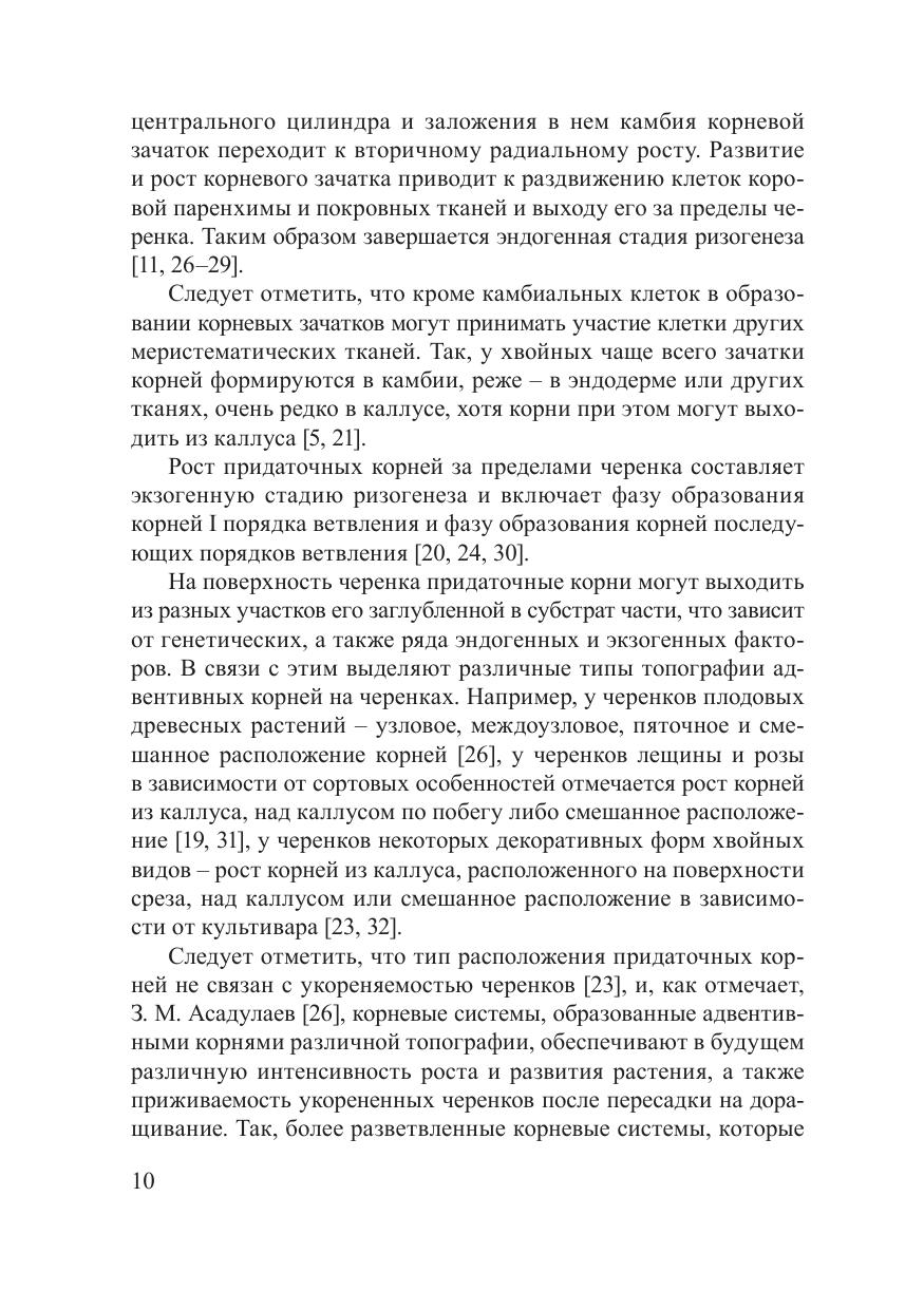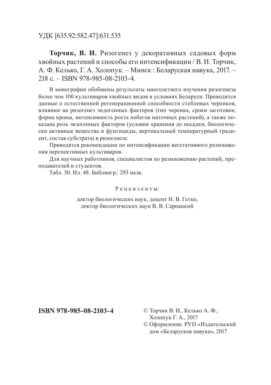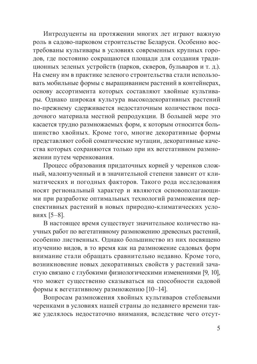 В монографии обобщены результаты многолетнего изучения ризогенеза более чем 100 культиваров хвойных видов в условиях Беларуси. Приводятся данные о естественной регенерационной способности стеблевых черенков, влиянии на ризогенез эндогенных факторов (тип черенка, сроки заготовки, форма кроны, интенсивность роста побегов маточных растений), а также показана роль экзогенных факторов (условия хранения до посадки, биологически активные вещества и фунгициды, вертикальный температурный градиент, состав субстрата) в ризогенезе. Приводятся рекомендации по интенсификации вегетативного размножения перспективных культиваров. Для научных работников, специалистов по размножению растений, преподавателей и студентов.