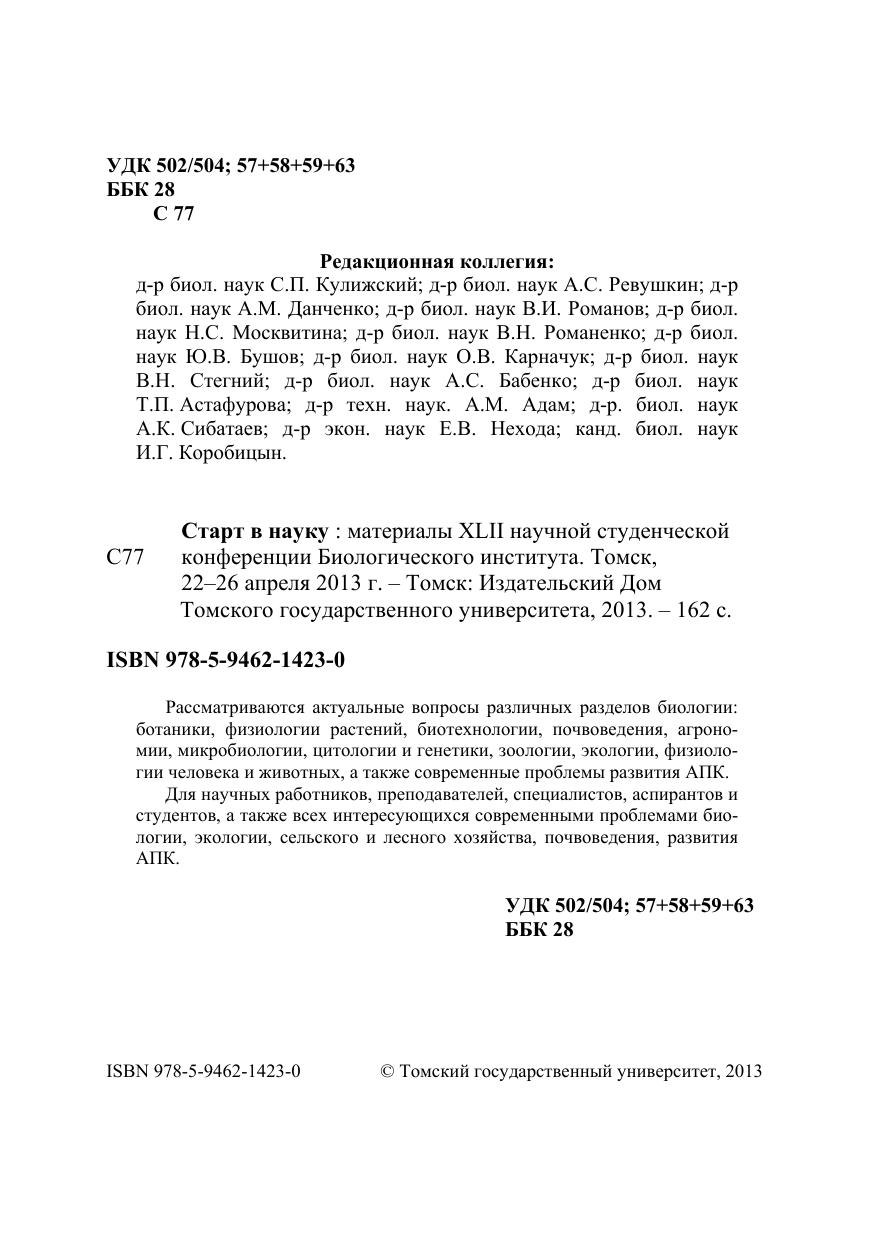 Рассматриваются актуальные вопросы различных разделов биологии: ботаники, физиологии растений, биотехнологии, почвоведения, агрономии, микробиологии, цитологии и генетики, зоологии, экологии, физиологии человека и животных, а также современные проблемы развития АПК. Для научных работников, преподавателей, специалистов, аспирантов и студентов, а также всех интересующихся современными проблемами биологии, экологии, сельского и лесного хозяйства, почвоведения, развития АПК.