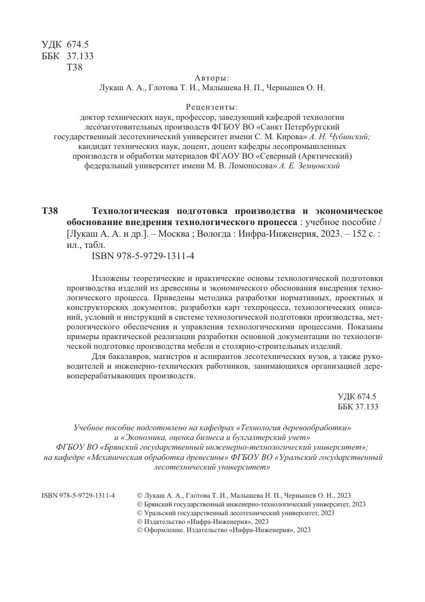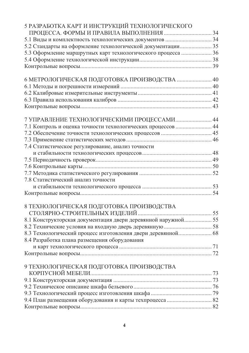 Изложены теоретические и практические основы технологической подготовки производства изделий из древесины и экономического обоснования внедрения технологического процесса. Приведены методика разработки нормативных, проектных и конструкторских документов; разработки карт техпроцесса, технологических описаний, условий и инструкций в системе технологической подготовки производства, метрологического обеспечения и управления технологическими процессами. Показаны примеры практической реализации разработки основной документации по технологической подготовке производства мебели и столярно-строительных изделий.