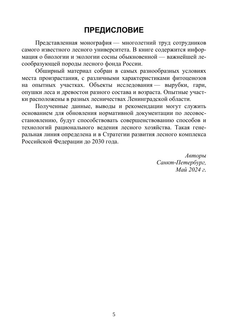 Монография содержит оригинальный материал по биологии и экологии сосны обыкновенной, полученный в ходе длительных исследований на стационарных объектах и временных опытных участках. Акцентируется внимание на особенностях естественного возобновления этой лесообразующей породы. Книга адресована широкому кругу читателей, специалистам лесного хозяйства, студентам, обучающимся по направлению «Лесное дело» и всем, интересующимся лесом.