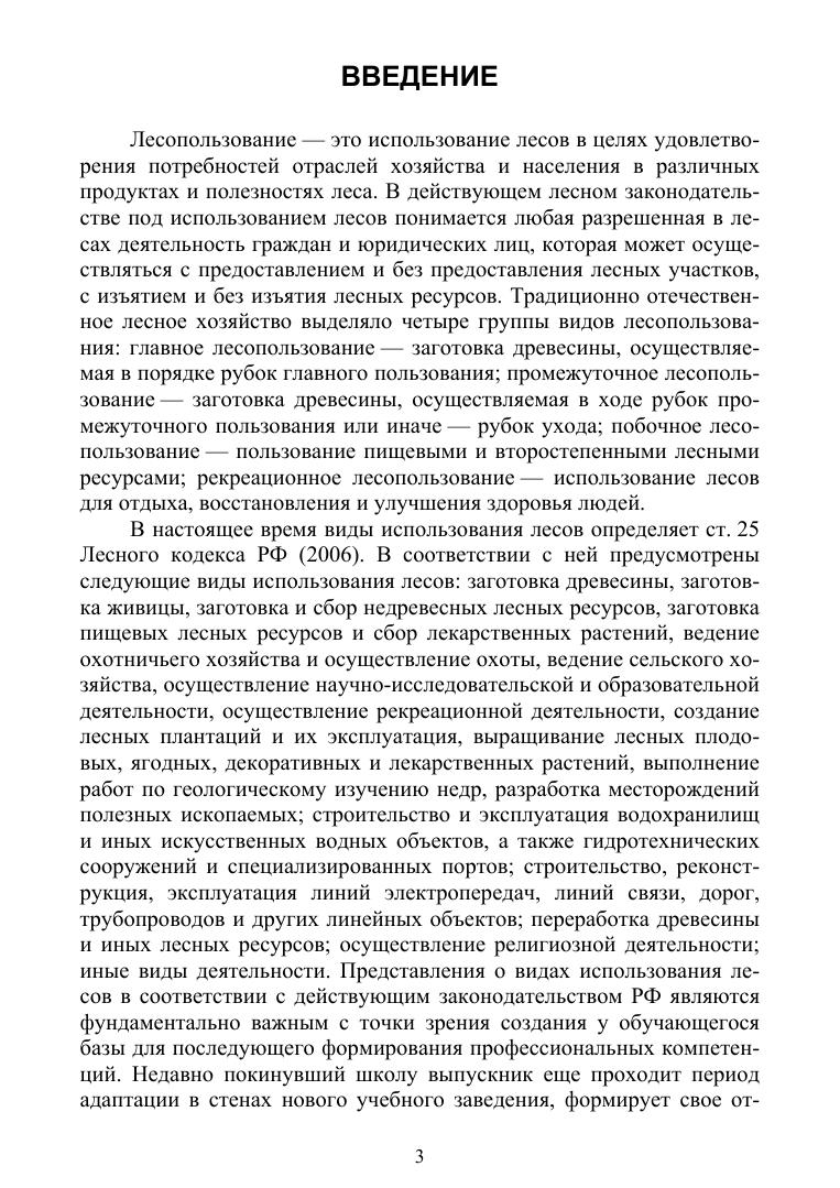 В учебном пособии рассматриваются основные аспекты рационального использования лесов в соответствии со ст. 25 Лесного кодекса РФ. Изложена основная информация по каждому виду использования лесов. Материал пособия формирует системную картину современной структуры лесопользования в лесах Государственного лесного фонда Российской Федерации и дает базовую информацию, необходимую для последующего освоения специализированных лесохозяйственных дисциплин. Для студентов лесных техникумов и колледжей. Соответствует современным требованиям Федерального государственного образовательного стандарта среднего профессионального образования и профессиональным квалификационным требованиям.