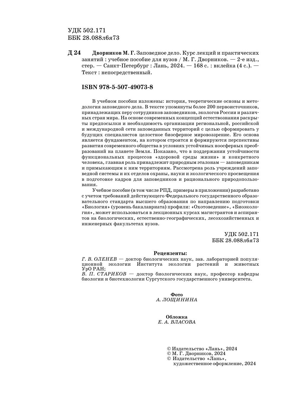 В учебном пособии изложены: история, теоретические основы и методология заповедного дела. В тексте упомянуты более 200 первоисточников, принадлежащих перу сотрудников заповедников, экологов России и различных стран мира. На основе современных концепций естествознания раскрыты предпосылки и необходимость организации региональной, российской и международной сети заповеданных территорий с целью сформировать у будущих специалистов целостное биосферное мировоззрение. Его основа является фундаментом, на котором строятся и формируются перспективы развития современного общества в условиях устойчивых ноосферных преобразований на планете Земля. Показано, что в поддержании устойчивости функциональных процессов «здоровой среды жизни» и конкретного человека главная роль принадлежит природным эталонам — заповедникам и примыкающим к ним территориям. Рассмотрена роль учреждений заповедной системы и их отделов охраны, науки и экологического просвещения в подготовке кадров для заповедников и рационального природопользования. Учебное пособие (в том числе РПД, примеры в приложении) разработано с учетом требований действующего федерального государственного образовательного стандарта высшего образования по направлению подготовки «Биология» (уровень бакалавриата) профили: «Охотоведение», «Биоэкология», может использоваться в лекционных курсах магистрантов и аспирантов на биологических, естественно-географических, лесохозяйственных и инженерных факультетах вузов.