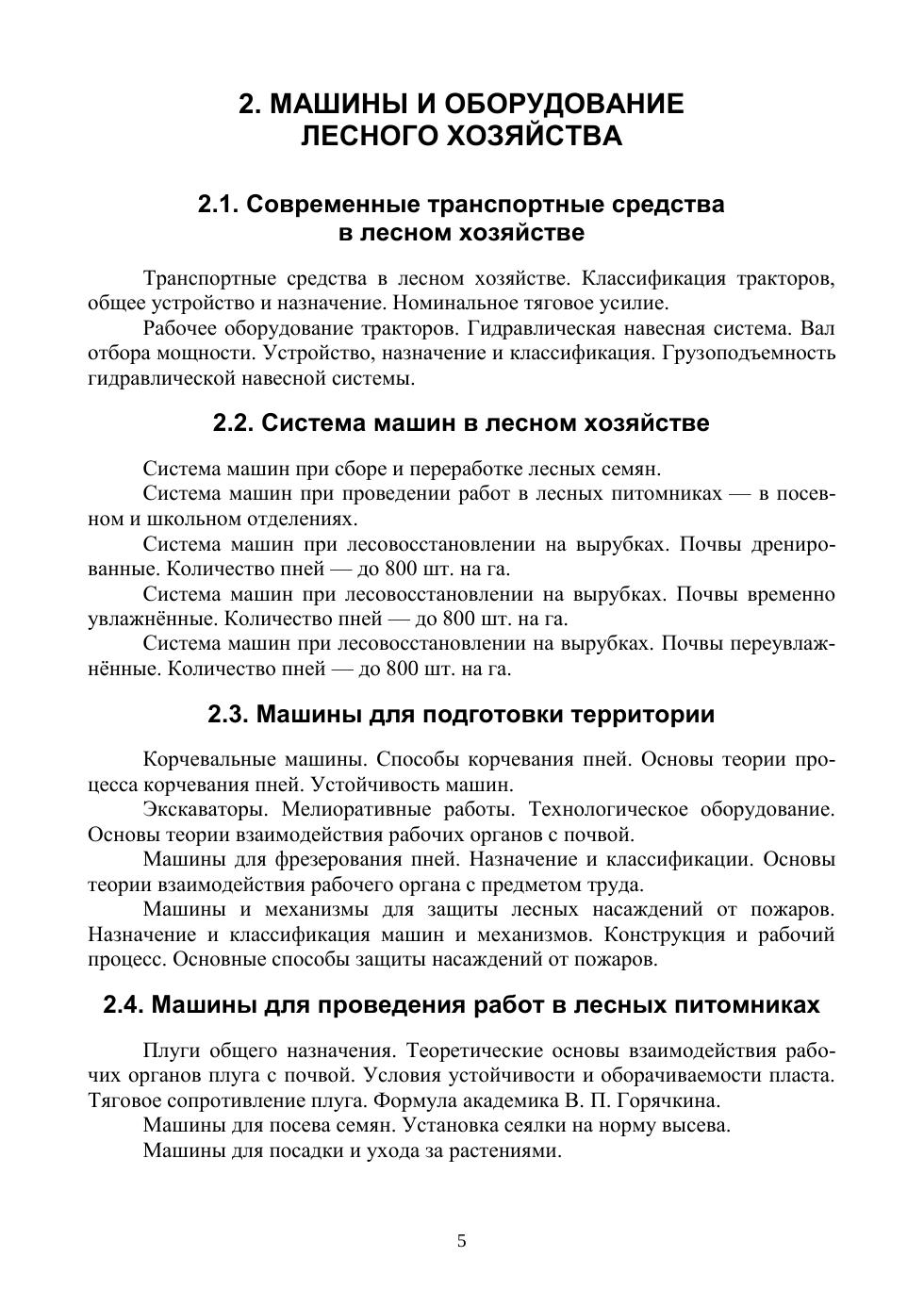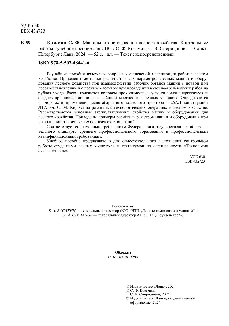 В учебном пособии изложены вопросы комплексной механизации работ в лесном хозяйстве. Приведены методики расчёта тяговых параметров лесных машин и обору-дования лесного хозяйства при взаимодействии рабочих органов машин с почвой при лесовосстановлении и с лесным массивом при проведении валочно-трелёвочных работ на рубках ухода. Рассматриваются вопросы проходимости и устойчивости энергетических средств при движении по пересечённой местности в лесных условиях. Определяются возможности применения малогабаритного колёсного трактора Т-25АЛ конструкции ЛТА им. С. М. Кирова на различных технологических операциях в лесном хозяйстве. Рассматриваются основные эксплуатационные свойства машин и оборудования для лесного хозяйства. Приведены примеры расчёта параметров машин и оборудования при выполнении различных технологических операций. Соответствует современным требованиям Федерального государственного образовательного стандарта среднего профессионального образования и профессиональным квалификационным требованиям. Учебное пособие предназначено для самостоятельного выполнения контрольной работы студентами лесных колледжей и техникумов по специальности «Технология лесозаготовок».