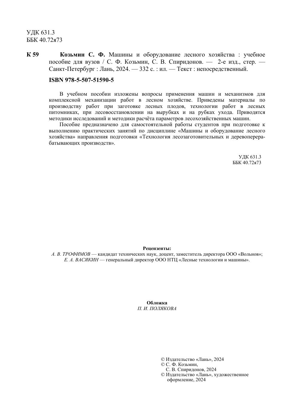 В учебном пособии изложены вопросы применения машин и механизмов для комплексной механизации работ в лесном хозяйстве. Приведены материалы по производству работ при заготовке лесных плодов, технологии работ в лесных питомниках, при лесовосстановлении на вырубках и на рубках ухода. Приводятся методики исследований и методики расчёта параметров лесохозяйственных машин. Пособие предназначено для самостоятельной работы студентов при подготовке к выполнению практических занятий по дисциплине «Машины и оборудование лесного хозяйства» направления подготовки «Технология лесозаготовительных и деревоперерабатывающих производств».