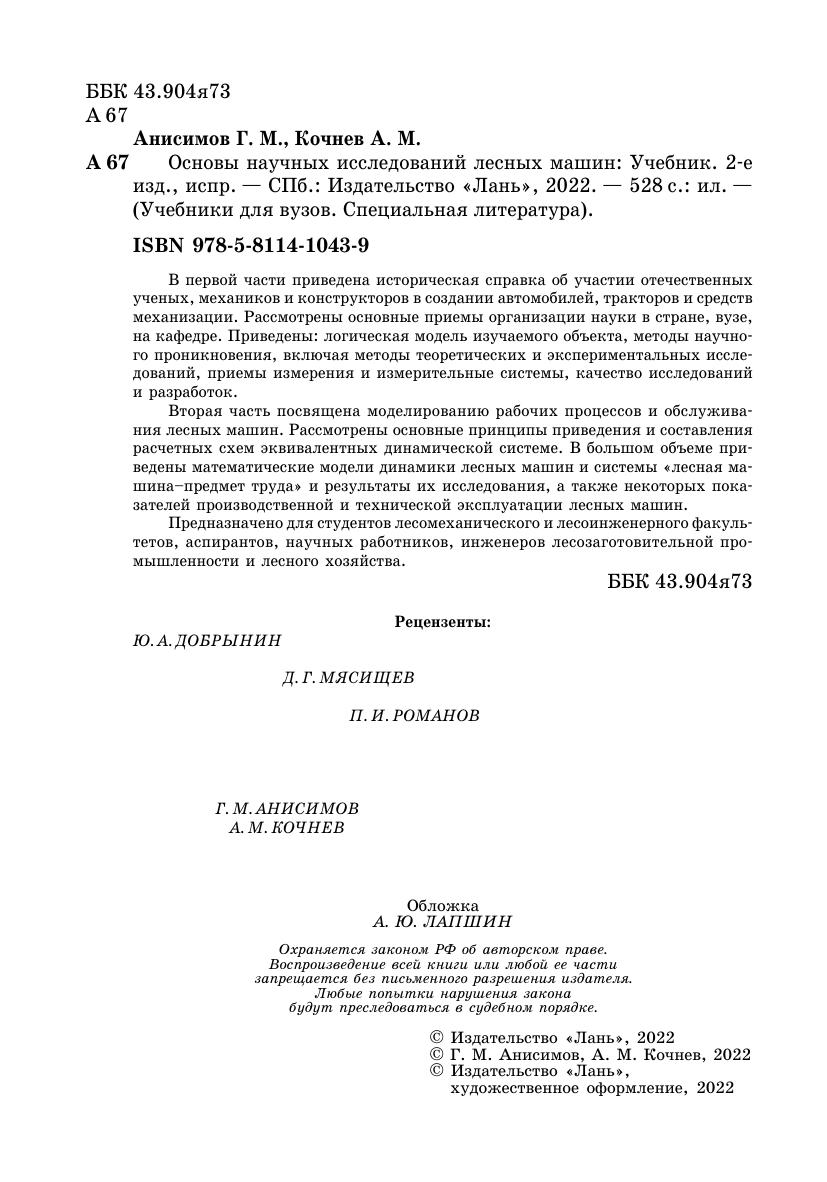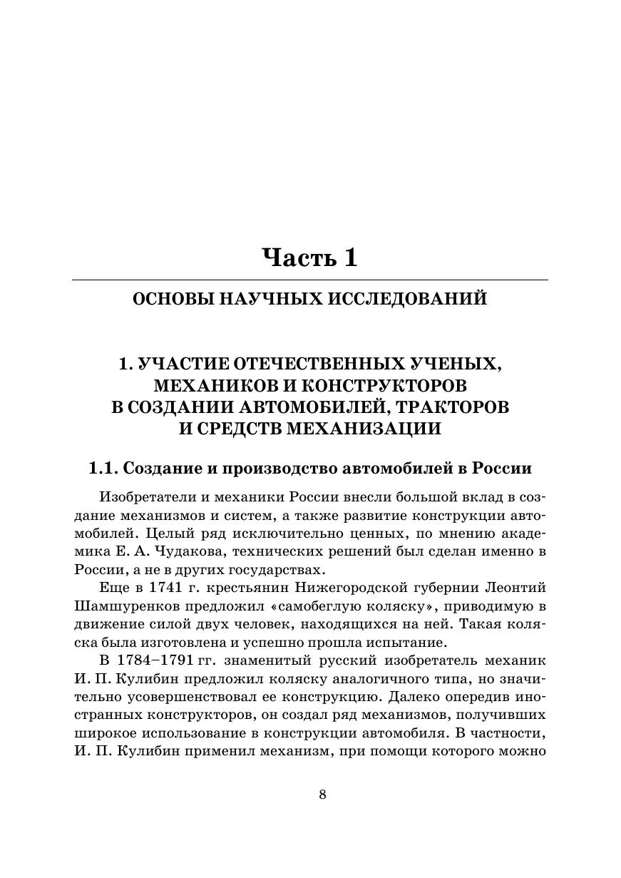 В первой части приведена историческая справка об участии отечественных ученых, механиков и конструкторов в создании автомобилей, тракторов и средств механизации. Рассмотрены основные приемы организации науки в стране, вузе, на кафедре. Приведены: логическая модель изучаемого объекта, методы научного проникновения, включая методы теоретических и экспериментальных исследований, приемы измерения и измерительные системы, качество исследований и разработок. Вторая часть посвящена моделированию рабочих процессов и обслуживания лесных машин. Рассмотрены основные принципы приведения и составления расчетных схем эквивалентных динамической системе. В большом объеме приведены математические модели динамики лесных машин и системы «лесная машина — предмет труда» и результаты их исследования, а также некоторых показателей производ¬ственной и технической эксплуатации лесных машин. Предназначено для студентов лесомеханического и лесоинженерного факультетов, аспирантов, научных работников, инженеров лесозаготовительной промышленности и лесного хозяйства.