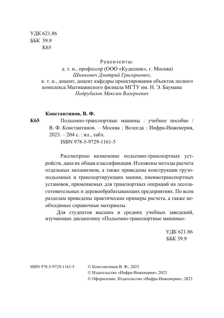 Рассмотрено назначение подъемно-транспортных устройств, дана их общая классификация. Изложены методы расчета отдельных механизмов, а также приведены конструкции грузоподъемных и транспортирующих машин, пневмотранспортных установок, применяемых для транспортных операций на лесозаготовительных и деревообрабатывающих предприятиях. По всем разделам приведены практические примеры расчета, а также необходимые справочные материалы.