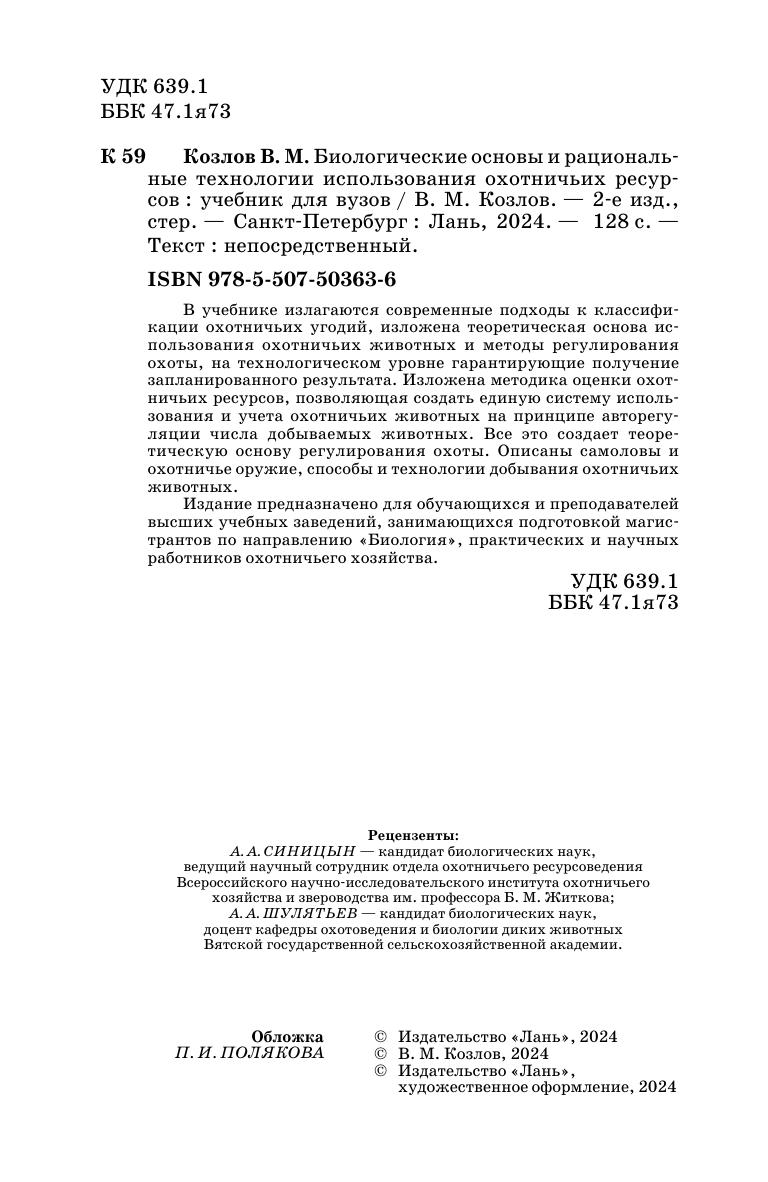 В учебнике излагаются современные подходы к классификации охотничьих угодий, изложена теоретическая основа использования охотничьих животных и методы регулирования охоты, на технологическом уровне гарантирующие получение запланированного результата. Изложена методика оценки охотничьих ресурсов, позволяющая создать единую систему использования и учёта охотничьих животных на принципе авторегуляции числа добываемых животных. Все это создает теоретическую основу регулирования охоты. Описаны самоловы и охотничье оружие, способы и технологии добывания охотничьих животных. Издание предназначено для обучающихся и преподавателей высших учебных заведений, занимающихся подготовкой магистрантов по направлению «Биология», практических и научных работников охотничьего хозяйства.