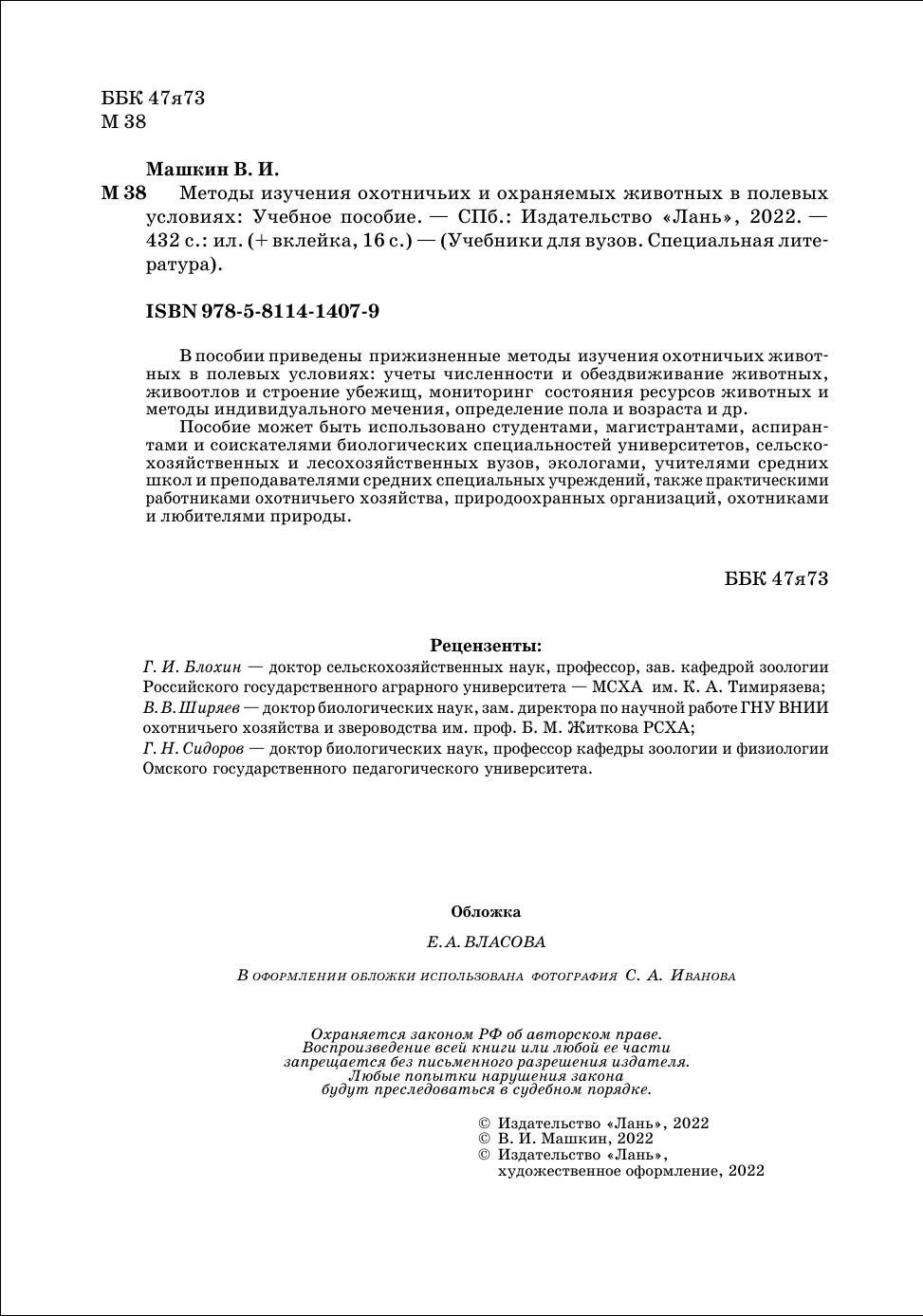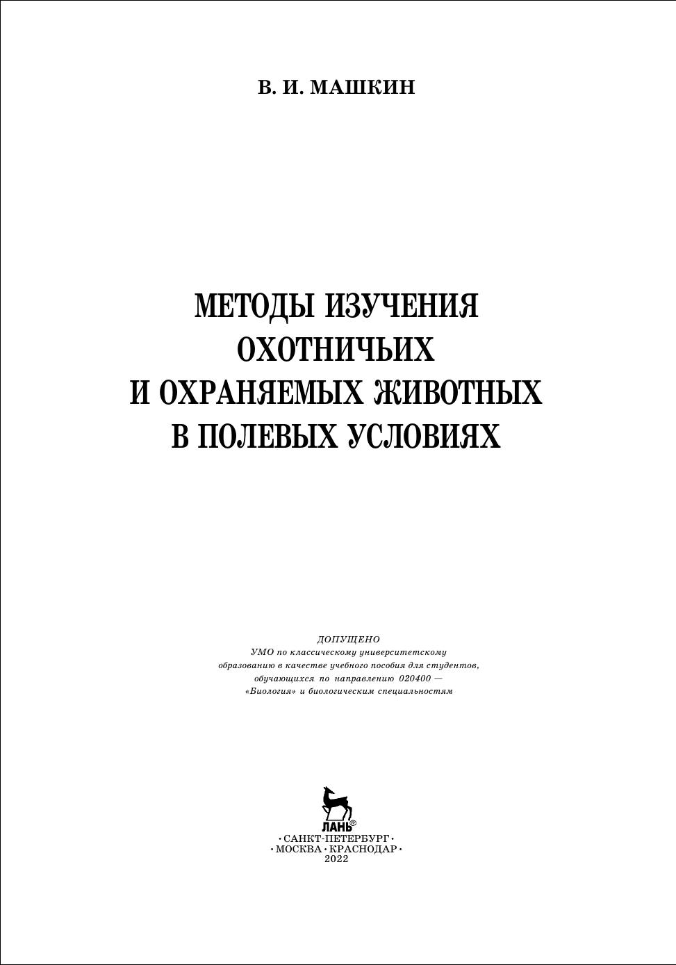 В пособии приведены прижизненные методы изучения охотничьих животных в полевых условиях: учеты численности и обездвиживание животных, живоотлов и строение убежищ, мониторинг состояния ресурсов животных и методы индивидуального мечения, определение пола и возраста и др. Пособие может быть использовано студентами, магистрантами, аспирантами и соискателями биологических специальностей университетов, сельскохозяйственных и лесохозяйственных вузов, экологами, учителями средних школ и преподавателями средних специальных учреждений, также практическими работниками охотничьего хозяйства, природоохранных организаций, охотниками и любителями природы.