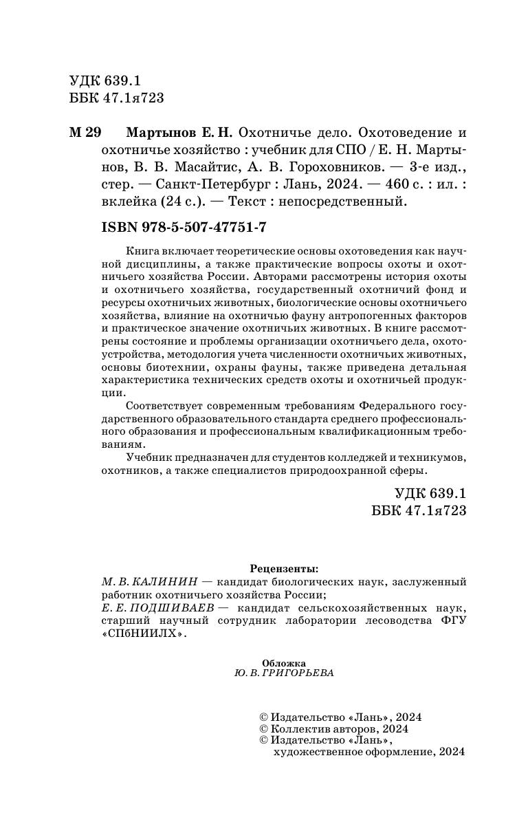 Книга включает теоретические основы охотоведения как научной дисциплины, а также практические вопросы охоты и охотничьего хозяйства России. Авторами рассмотрены история охоты и охотничьего хозяйства, государственный охотничий фонд и ресурсы охотничьих животных, биологические основы охотничьего хозяйства, влияние на охотничью фауну антропогенных факторов и практическое значение охотничьих животных. В книге рассмотрены состояние и проблемы организации охотничьего дела, охотоустройства, методология учета численности охотничьих животных, основы биотехнии, охраны фауны, также приведена детальная характеристика технических средств охоты и охотничьей продукции. Соответствует современным требованиям Федерального государственного образовательного стандарта среднего профессионального образования и профессиональным квалификационным требованиям. Учебник предназначен для студентов колледжей и техникумов, охотников, а также специалистов природоохранной сферы.