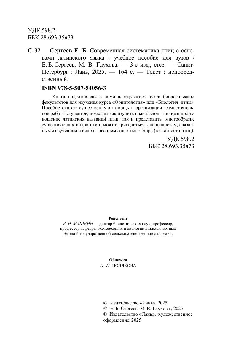 Книга подготовлена в помощь студентам биологических факультетов для изучения курса «Орнитология» или «Биология птиц». Пособие окажет существенную помощь в организации самостоятельной работы студентов, позволит как изучить правильное чтение и произношение латинских названий птиц, так и представить многообразие существующих видов птиц, может пригодиться специалистам, связанным с изучением и использованием животного мира (в частности птиц).