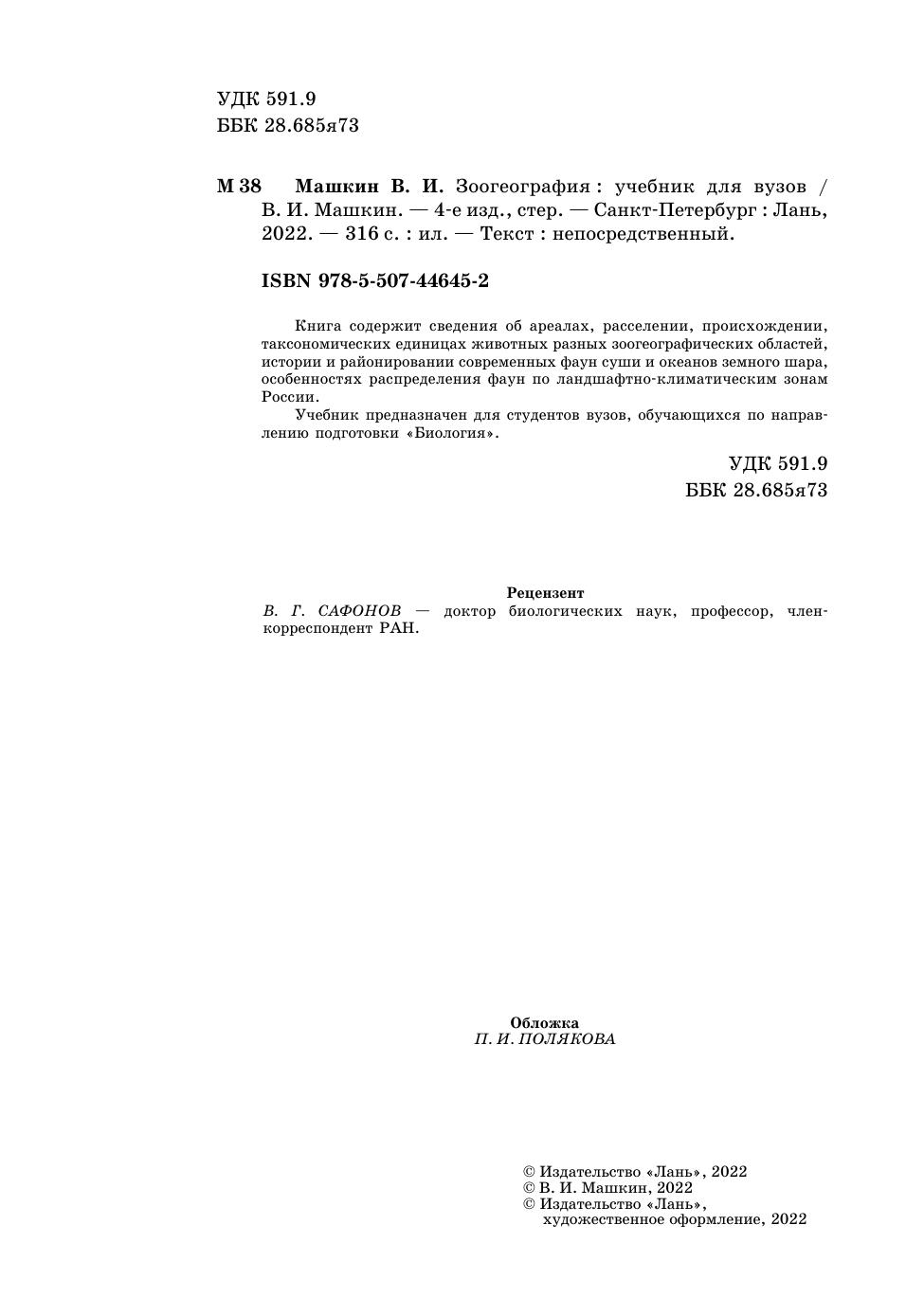 Книга содержит сведения об ареалах, расселении, происхождении, таксономических единицах животных разных зоогеографических областей, истории и районировании современных фаун суши и океанов земного шара, особенностях распределения фаун по ландшафтно-климатическим зонам России. Учебник предназначен для студентов, обучающихся по направлению подготовки «Биология».