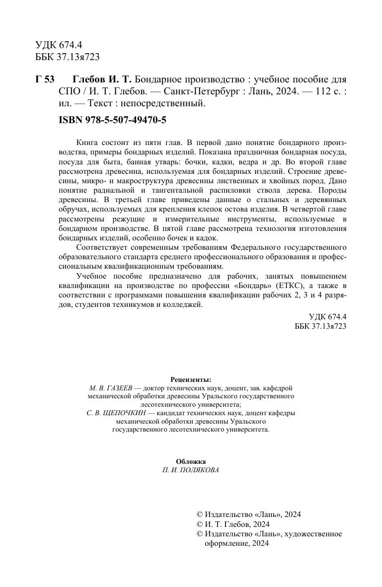 Книга состоит из пяти глав. В первой дано понятие бондарного производства, примеры бондарных изделий. Показана праздничная бондарная посуда, посуда для быта, банная утварь: бочки, кадки, ведра и др. Во второй главе рассмотрена древесина, используемая для бондарных изделий. Строение древесины, микро- и макроструктура древесины лиственных и хвойных пород. Дано понятие радиальной и тангентальной распиловки ствола дерева. Породы древесины. В третьей главе приведены данные о стальных и деревянных обручах, используемых для крепления клепок остова изделия. В четвертой главе рассмотрены режущие и измерительные инструменты, используемые в бондарном производстве. В пятой главе рассмотрена технология изготовления бондарных изделий, особенно бочек и кадок. Соответствует современным требованиям Федерального государственного образовательного стандарта среднего профессионального образования и профессиональным квалификационным требованиям. Учебное пособие предназначено для рабочих, занятых повышением квалификации на производстве по профессии «Бондарь» (ЕТКС), а также в соответствии с программами повышения квалификации рабочих 2, 3 и 4 разрядов, студентов техникумов и колледжей.