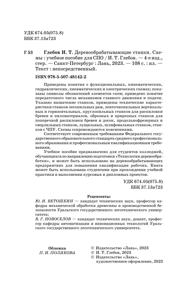 Приведены понятия о схемах функциональных, кинематических, гидравлических, пневматических и электрических, показаны символы обозначений элементов схем, приведено понятие передаточного числа механизмов главного движения и подачи. Указано назначение станков, приведены технические характеристики станков лесопильных рам, ленточнопильных вертикальных и горизонтальных, круглопильных станков для распиловки бревен и пиломатериалов, обрезных, прирезных, станков для поперечной распиловки бревен и досок, продольно-фрезерных и сверлильных станков, лущильных, шлифовальных станков, станков с ЧПУ. Схемы сопровождаются пояснениями. Соответствует современным требованиям Федерального государственного образовательного стандарта среднего профессионального образования и профессиональным квалификационным требованиям. Учебное пособие предназначено для студентов колледжей, обучающихся по направлению подготовки «Технология деревообработки» и может быть использовано на деревообрабатывающих предприятиях для повышения квалификации рабочих. Книга может быть использована студентами при прохождении учебной практики, при выполнении курсовых и дипломных проектов.