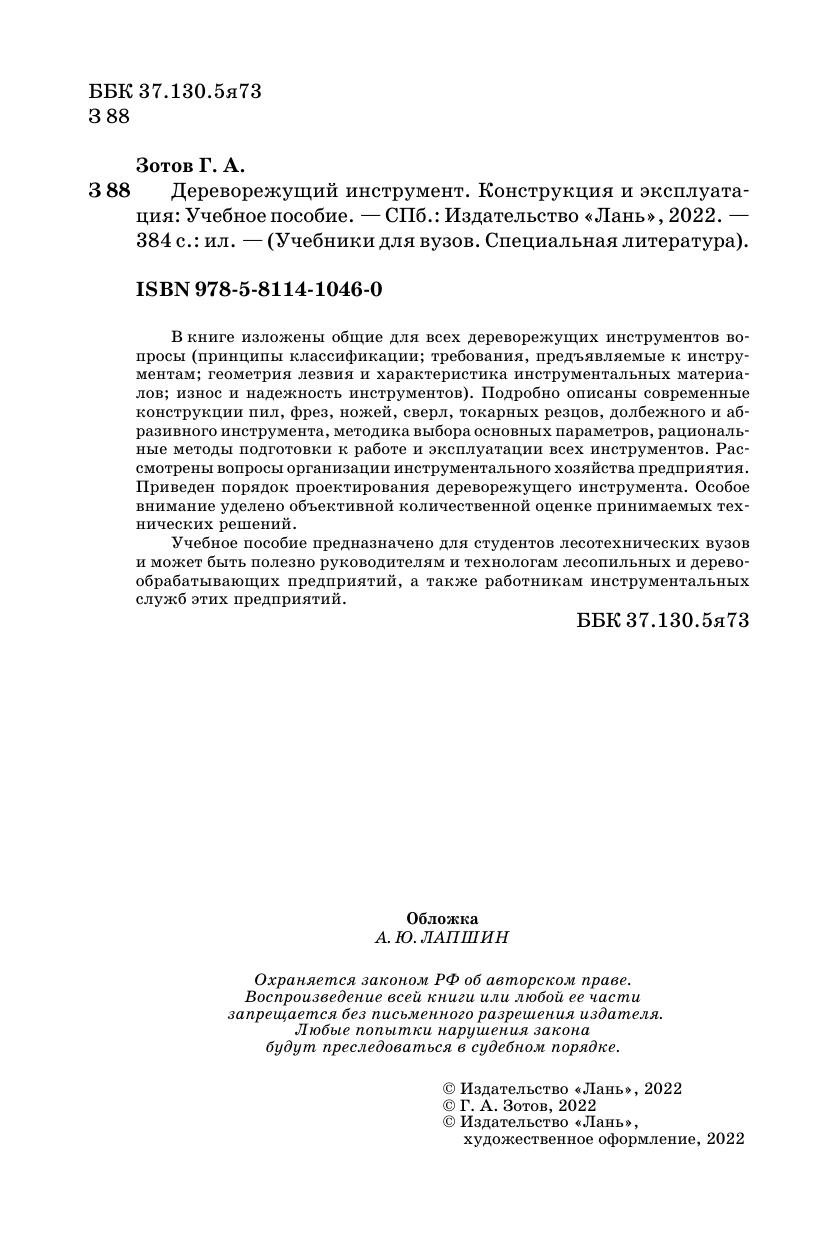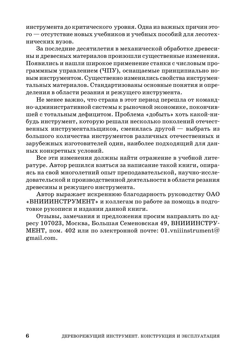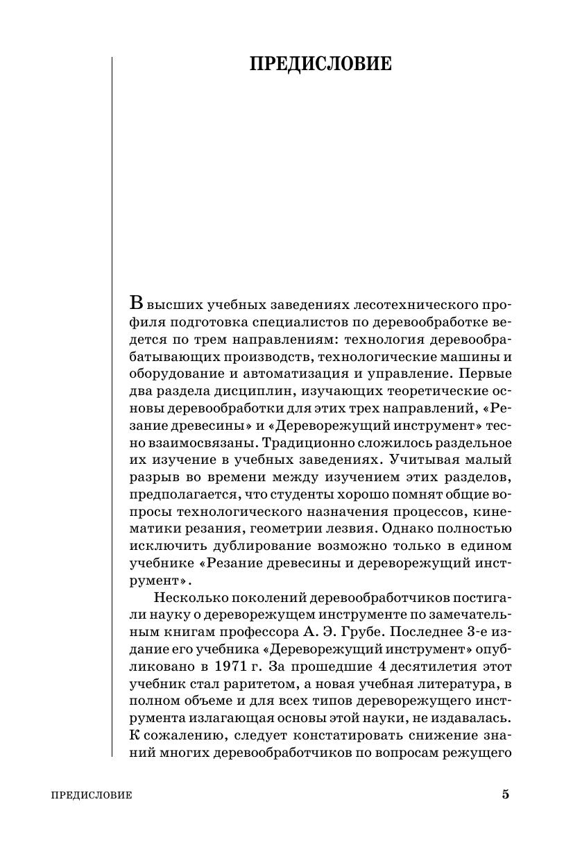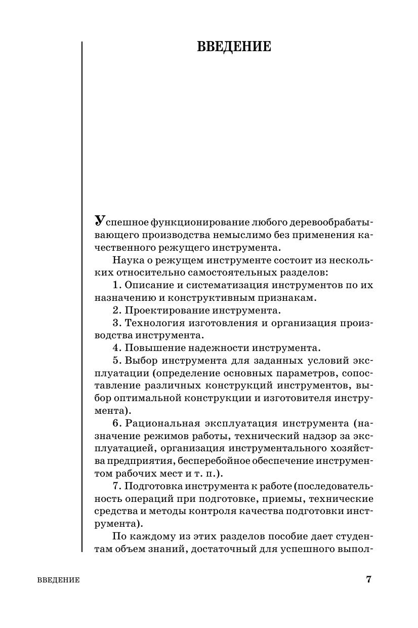 В книге изложены общие для всех дереворежущих инструментов вопросы (принципы классификации, требования, предъявляемые к инструментам, геометрия лезвия и характеристика инструментальных материалов, износ и надежность инструментов). Подробно описаны современные конструкции пил, фрез, ножей, сверл, токарных резцов, долбежного и абразивного инструмента, методика выбора основных параметров, рациональные методы подготовки к работе и эксплуатации всех инструментов. Рассмотрены вопросы организации инструментального хозяйства предприятия. Приведен порядок проектирования дереворежущего инструмента. Особое внимание уделено объективной количественной оценке принимаемых технических решений. Учебное пособие предназначено для студентов лесотехнических вузов и может быть полезно руководителям и технологам лесопильных и деревообрабатывающих предприятий, а также работникам инструментальных служб этих предприятий.