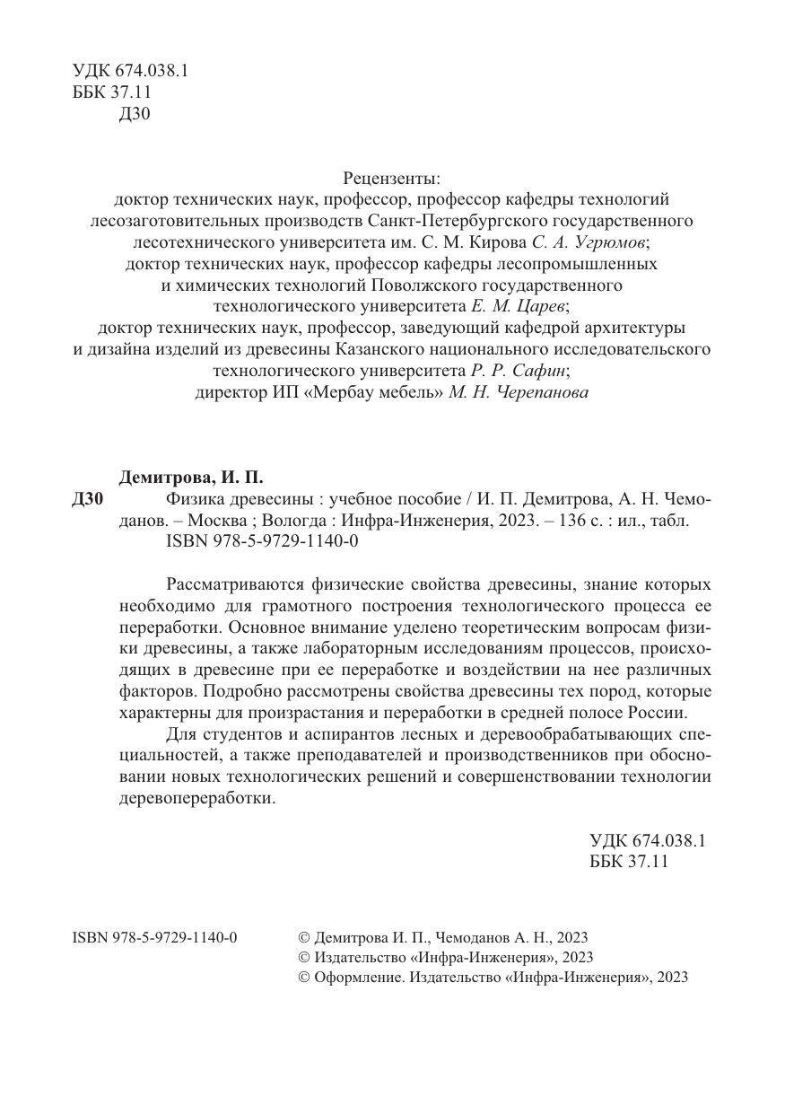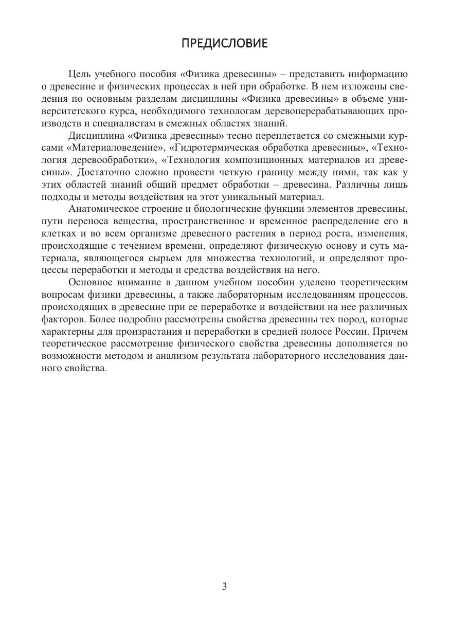 Рассматриваются физические свойства древесины, знание которых необходимо для грамотного построения технологического процесса ее переработки. Основное внимание уделено теоретическим вопросам физики древесины, а также лабораторным исследованиям процессов, происходящих в древесине при ее переработке и воздействии на нее различных факторов. Подробно рассмотрены свойства древесины тех пород, которые характерны для произрастания и переработки в средней полосе России.
