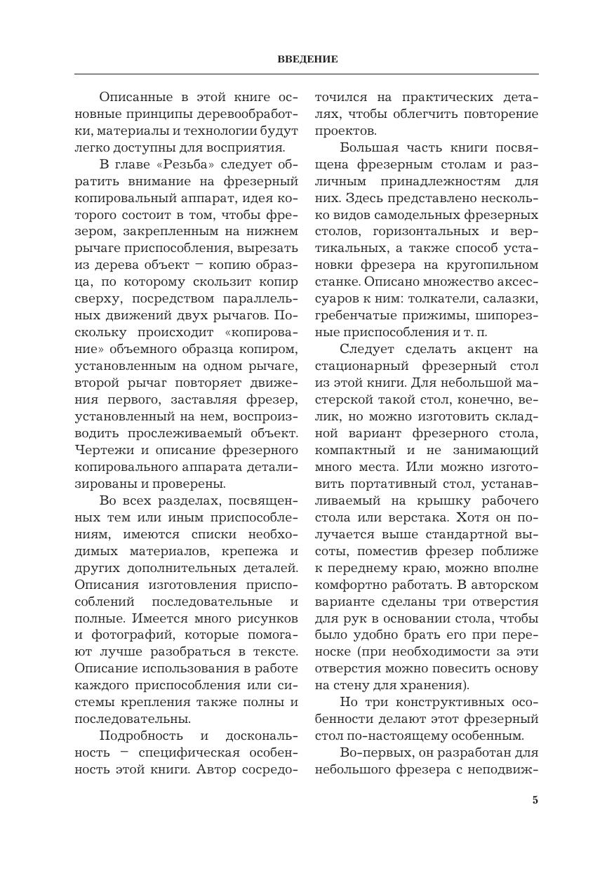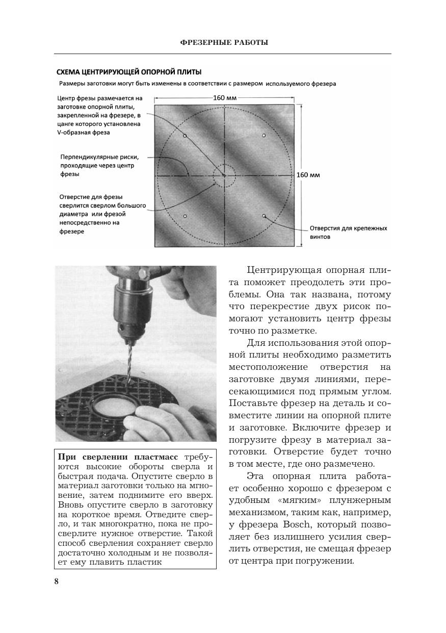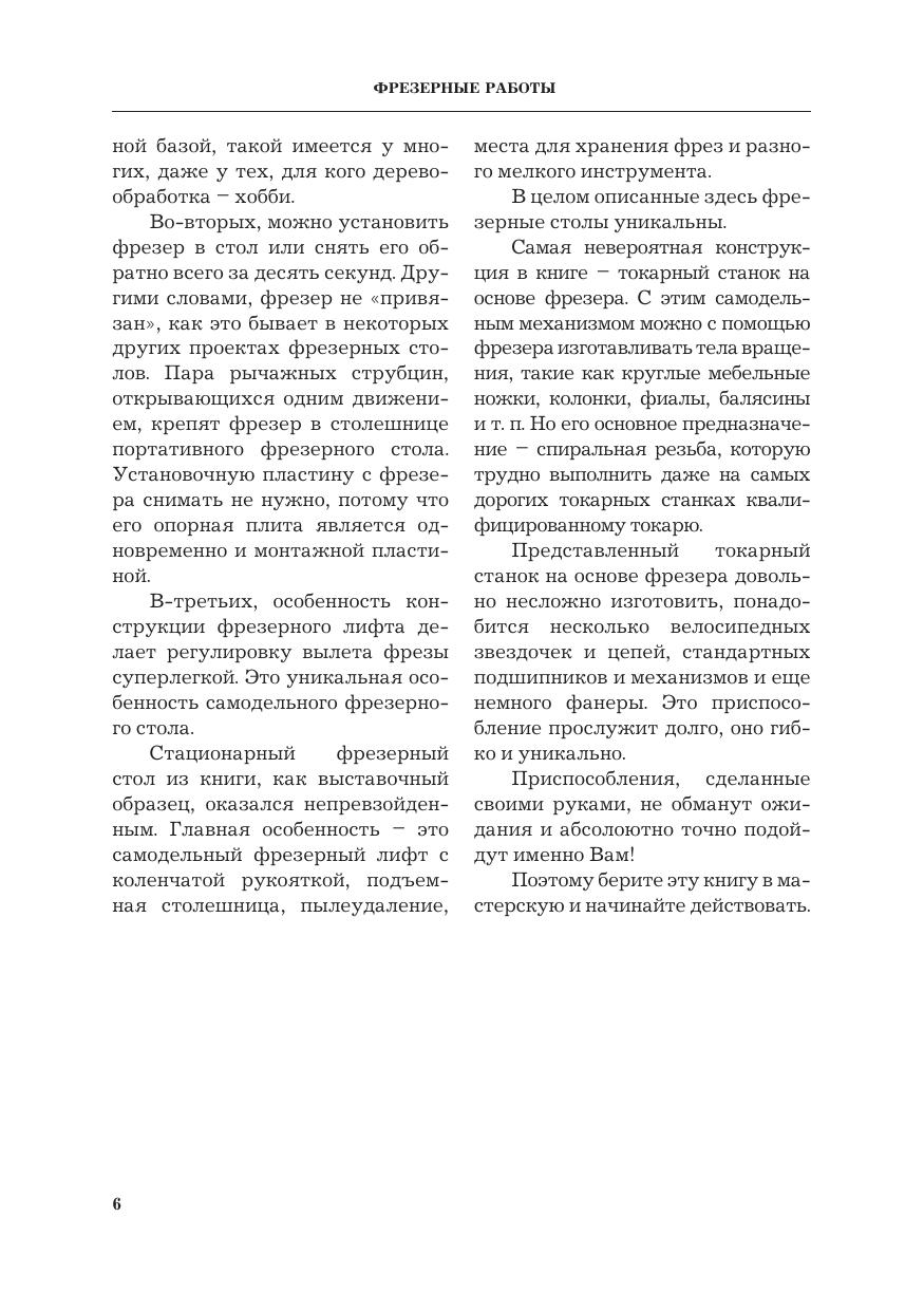Рассмотрены основные принципы деревообработки. Представлено несколько видов самодельных фрезерных столов, горизонтальных и вертикальных, а также способ установки фрезера на круглопильном станке. Даны чертежи различных приспособлений, зажимов и оснастки для фрезера.