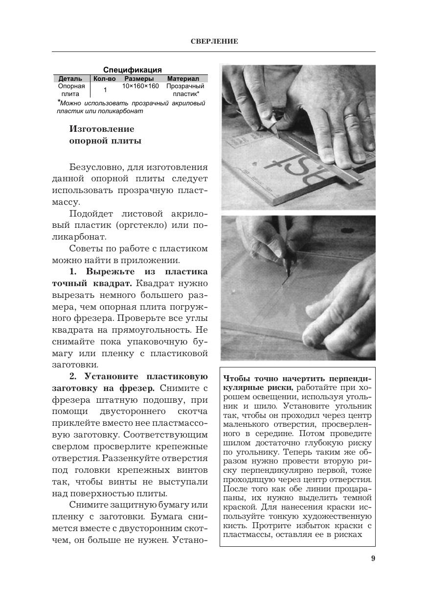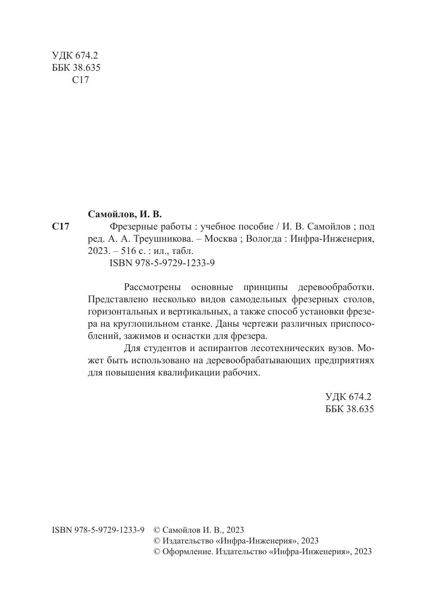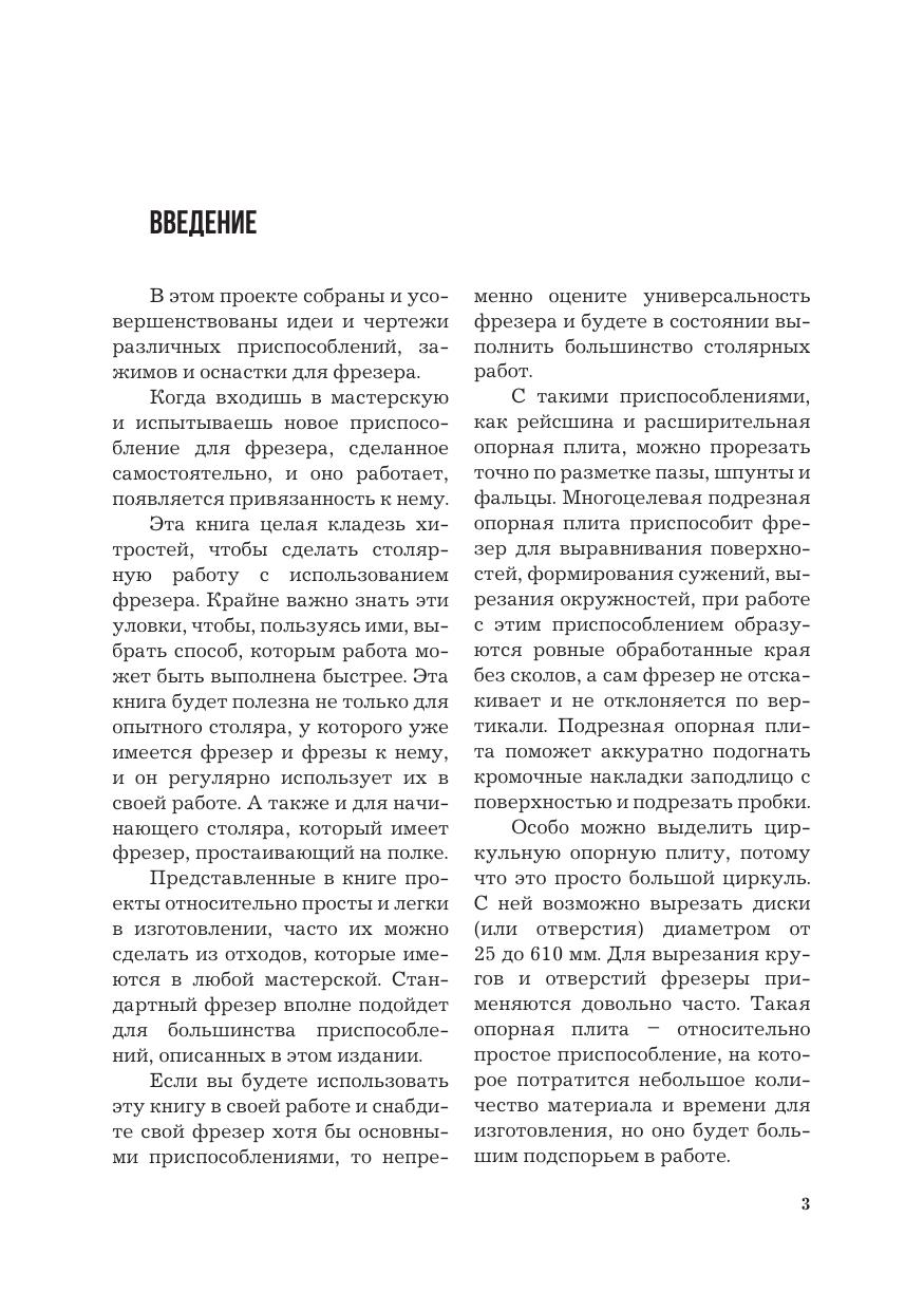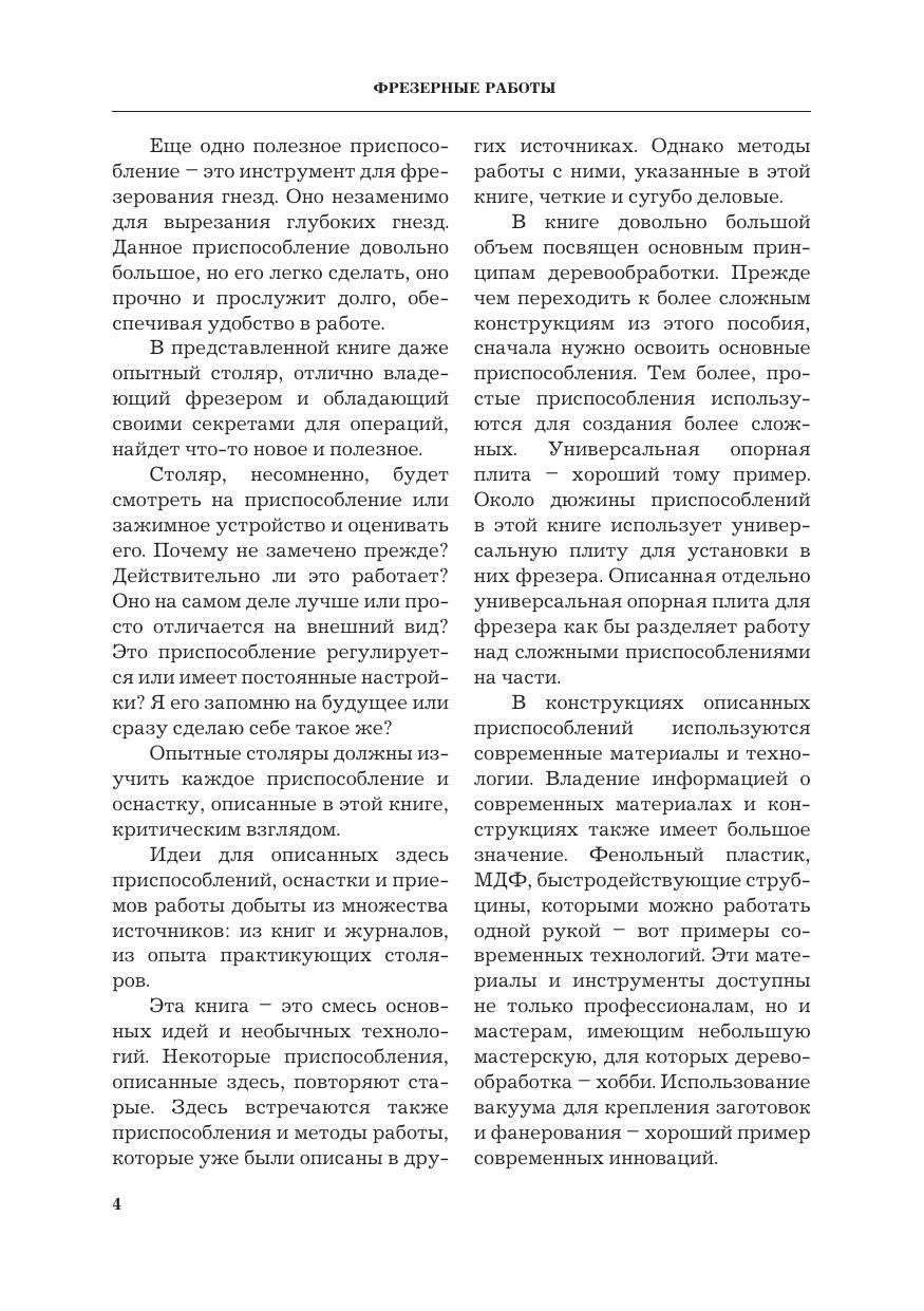 Рассмотрены основные принципы деревообработки. Представлено несколько видов самодельных фрезерных столов, горизонтальных и вертикальных, а также способ установки фрезера на круглопильном станке. Даны чертежи различных приспособлений, зажимов и оснастки для фрезера.