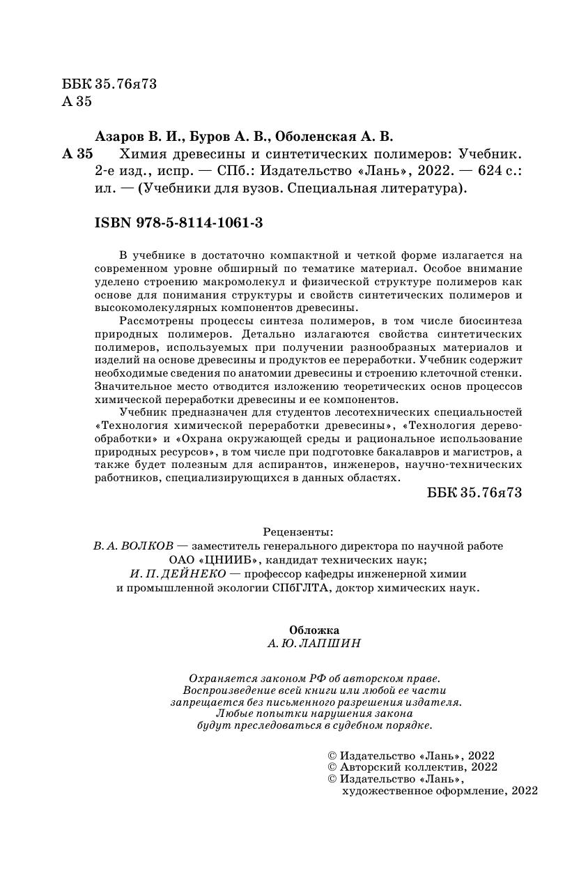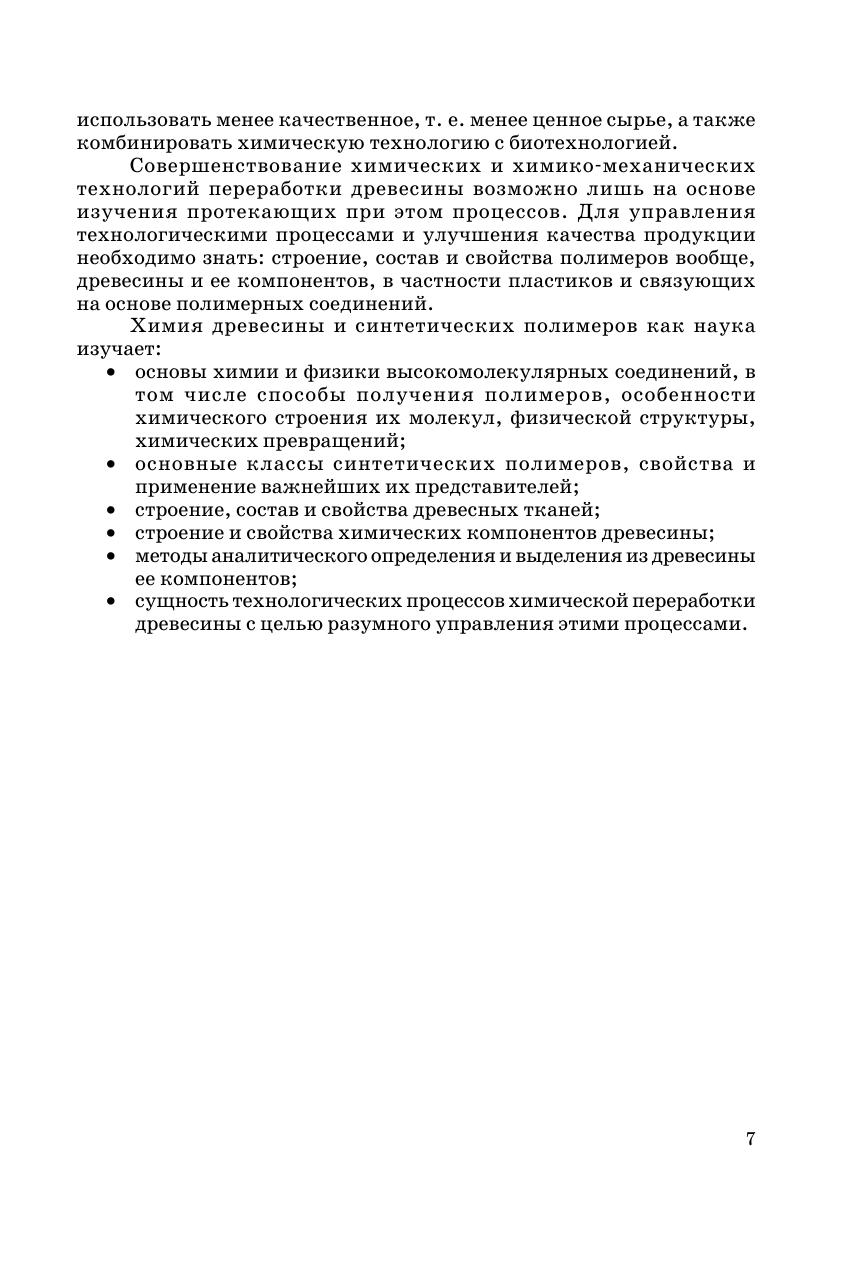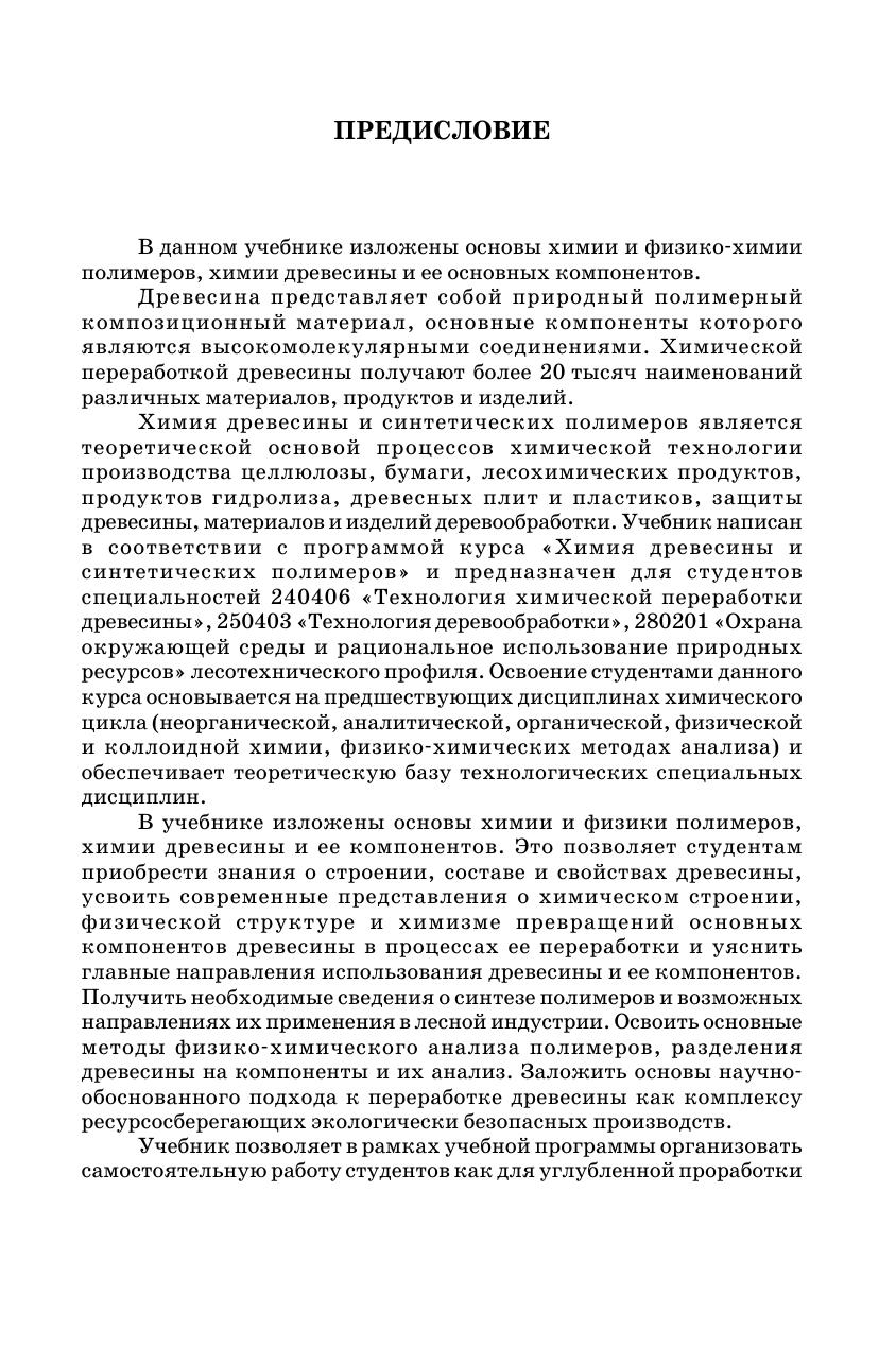 В учебнике в достаточно компактной и четкой форме излагается на современном уровне обширный по тематике материал. Особое внимание уделено строению макромолекул и физической структуре полимеров как основе для понимания структуры и свойств синтетических полимеров и высокомолекулярных компонентов древесины. Рассмотрены процессы синтеза полимеров, в том числе биосинтеза природных полимеров. Детально излагаются свойства синтетических полимеров, используемых при получении разнообразных материалов и изделий на основе древесины и продуктов ее переработки. Учебник содержит необходимые сведения по анатомии древесины и строению клеточной стенки. Значительное место отводится изложению теоретических основ процессов химической переработки древесины и ее компонентов. Учебник предназначен для студентов лесотехнических специальностей «Технология химической переработки древесины» и «Технология деревообработки» и «Охрана окружающей среды и рациональное использование природных ресурсов», в том числе при подготовке бакалавров и магистров, а также будет полезным для аспирантов, инженеров, научно-технических работников, специализирующихся в данных областях.