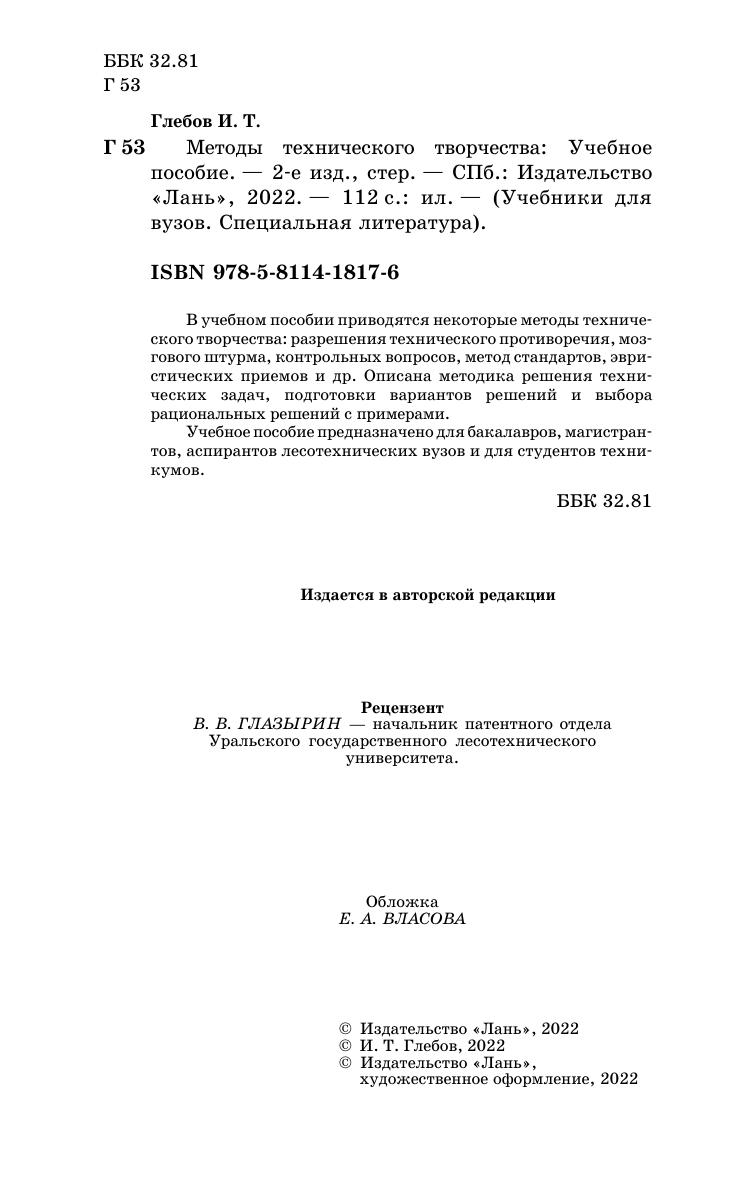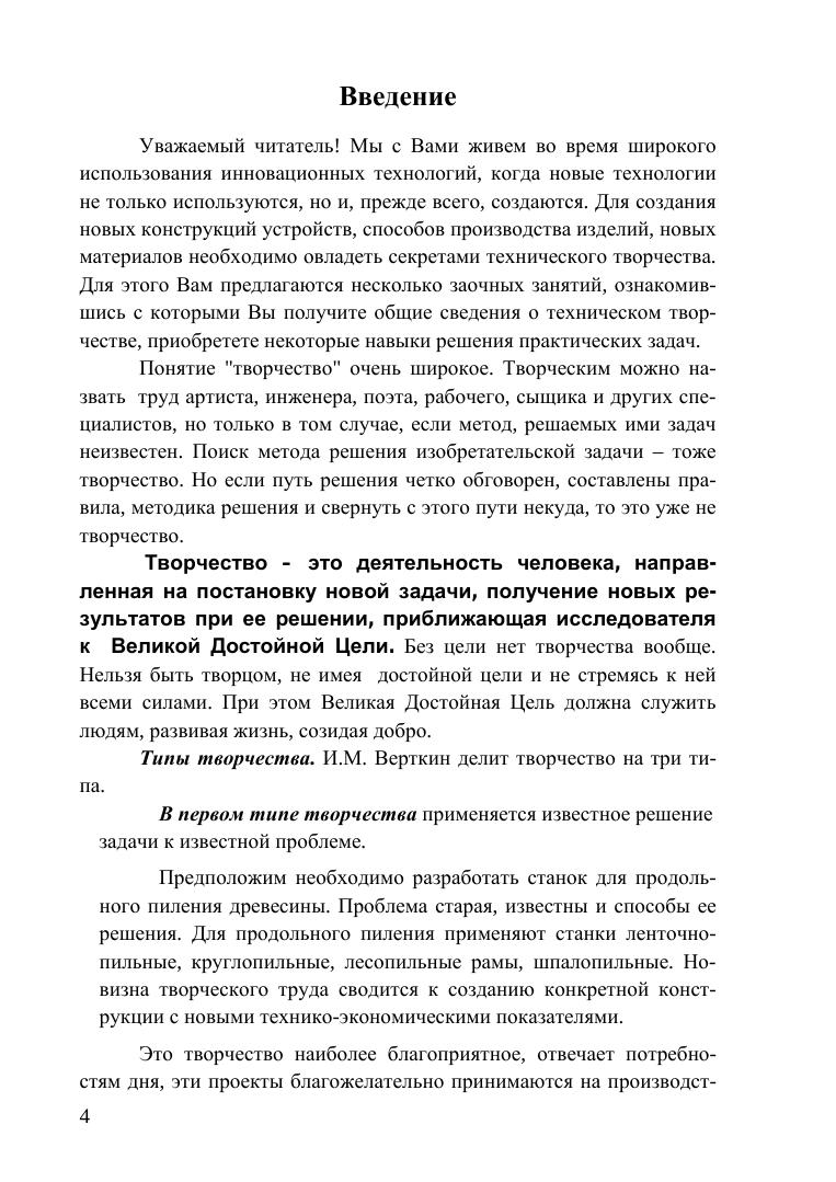В учебном пособии приводятся некоторые методы технического творчества: разрешения технического противоречия, мозгового штурма, контрольных вопросов, метод стандартов, эвристических приемов и др. Описана методика решения технических задач, подготовки вариантов решений и выбора рациональных решений с примерами. Учебное пособие предназначено для бакалавров, магистрантов, аспирантов лесотехнических вузов и для студентов техникумов.