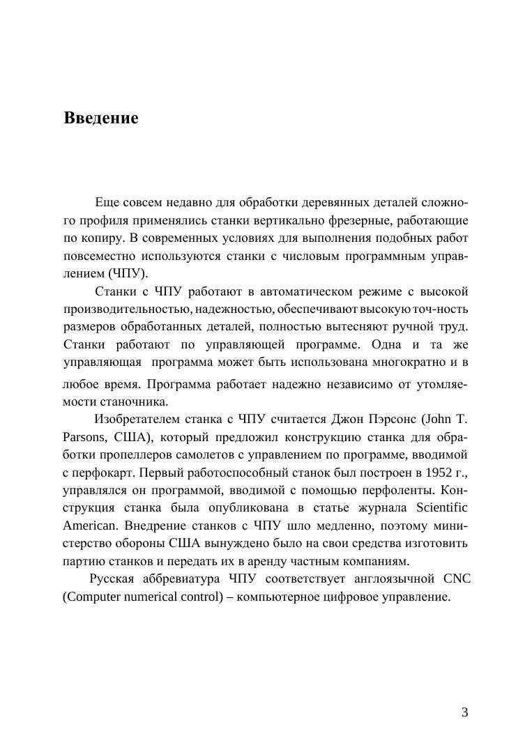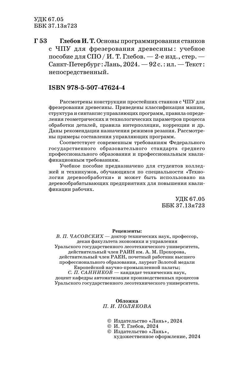 Рассмотрены конструкции простейших станков с ЧПУ для фрезерования древесины. Приведены классификация машин, структура и синтаксис управляющих программ, правила определения геометрических и технологических параметров процесса обработки деталей, правила интерполяции, коррекции и др. Даны рекомендации назначения режимов резания. Рассмотрены примеры составления управляющих программ. Соответствует современным требованиям Федерального государственного образовательного стандарта среднего профессионального образования и профессиональным квалификационным требованиям. Учебное пособие предназначено для студентов колледжей и техникумов, обучающихся по специальности «Технология деревообработки» и может быть использовано на деревообрабатывающих предприятиях для повышения квалификации рабочих.