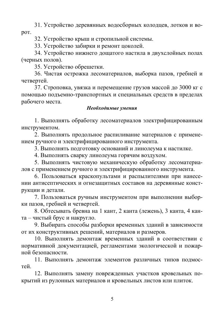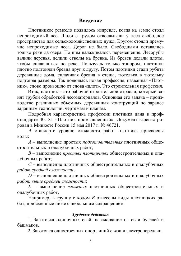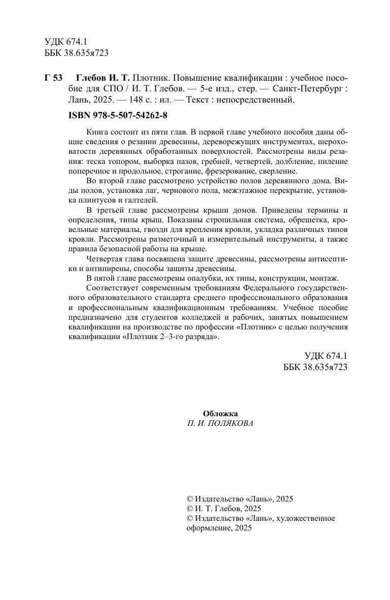 Книга состоит из пяти глав. В первой главе учебного пособия даны общие сведения о резании древесины, дереворежущих инструментах, шероховатости деревянных обработанных поверхностей. Рас-смотрены виды резания: теска топором, выборка пазов, гребней, четвертей, долбление, пиление поперечное и продольное, строгание, фре-зерование, сверление. Во второй главе рассмотрено устройство полов деревянного дома. Виды полов, установка лаг, чернового пола, межэтажное перекрытие, установка плинтусов и галтелей. В третьей главе рассмотрены крыши домов. Приведены термины и определения, типы крыш. Показаны стропильная система, обрешетка, кровельные материалы, гвозди для крепления кровли, укладка различных типов кровли. Рассмотрены разметочный и измерительный инструменты, а также правила безопасной работы на крыше. Четвертая глава посвящена защите древесины, рассмотрены антисептики и антипирены, способы защиты древесины. В пятой главе рассмотрены опалубки, их типы, конструкции, монтаж. Соответствует современным требованиям Федерального государственного образовательного стандарта среднего профессионального образования и профессиональным квалификационным требованиям. Учебное пособие предназначено для рабочих, занятых повышением квалификации на производстве по профессии «Плотник» с целью получения квалификации «плотник 2–3-го разряда».