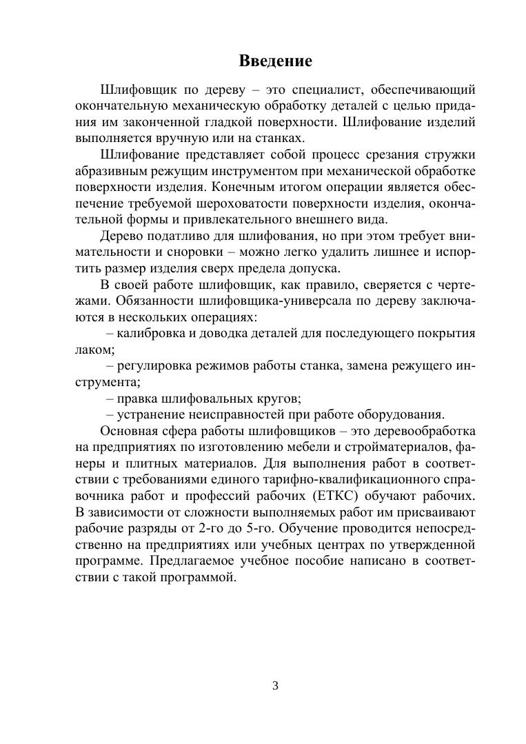 Книга состоит из шести глав. В первой главе учебного пособия даны общие сведения о строении дерева. Показаны макроструктура дерева, приведены основные породы, физические свойства: гигроскопичность, плотность, деформативность, влажность. Рассмотрены пороки древесины, классификация древесных материалов, композиционные материалы. Вторая глава посвящена теории шлифования древесины. Приведены данные о рабочих движениях, производительности, затуплении инструмента. В третьей главе рассмотрены данные о шероховатости шлифованной поверхности, способах определения шероховатости. Четвертая глава посвящена абразивному шлифовальному инструменту, шлифовальным материалам, шкуркам, кругам. В пятой главе рассмотрены шлифовальные станки: узколенточные, широколенточные, универсальные. В шестой главе рассмотрена безопасность работы при шлифовании. Соответствует современным требованиям Федерального государственного образовательного стандарта среднего профессионального образования и профессиональным квалификационным требованиям. Учебное пособие предназначено для рабочих, занятых повышением квалификации на производстве с целью получения квалификации шлифовщика 2–6 разряда.