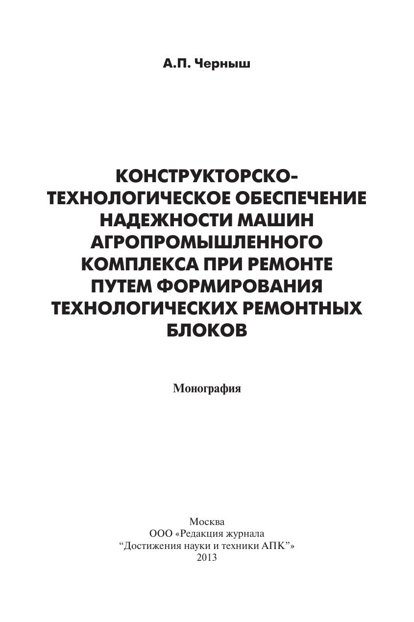 Конструкторско-технологическое обеспечение надежности машин агропромышленного комплекса при ремонте путем формирования технологических ремонтных блоков: монография