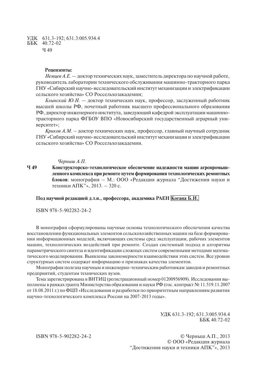 В монографии сформулированы научные основы технологического обеспечения качества восстановления функциональных элементов сельскохозяйственных машин на базе формирования информационных моделей, включающих системы сред эксплуатации, рабочих элементов машин, технологических воздействий при ремонте. Создан системный подход и алгоритмы параметрического синтеза и идентификации сложных систем современными методами математического моделирования. Выявлены закономерности взаимодействия этих систем. Все уровни структурных систем содержат информацию о признаках качества элементов. Монография полезна научным и инженерно-техническим работникам заводов и ремонтных предприятий, студентам технических вузов. Тема зарегистрирована в ВНТИЦ (регистрационный номер 01200956909). Исследования выполнены в рамках гранта Министерства образования и науки РФ (гос. контракт № 11.519.11.2007 от 18.08.2011 г.) по ФЦП «Исследования и разработки по приоритетным направлениям развития научно-технологического комплекса России на 2007-2013 годы»