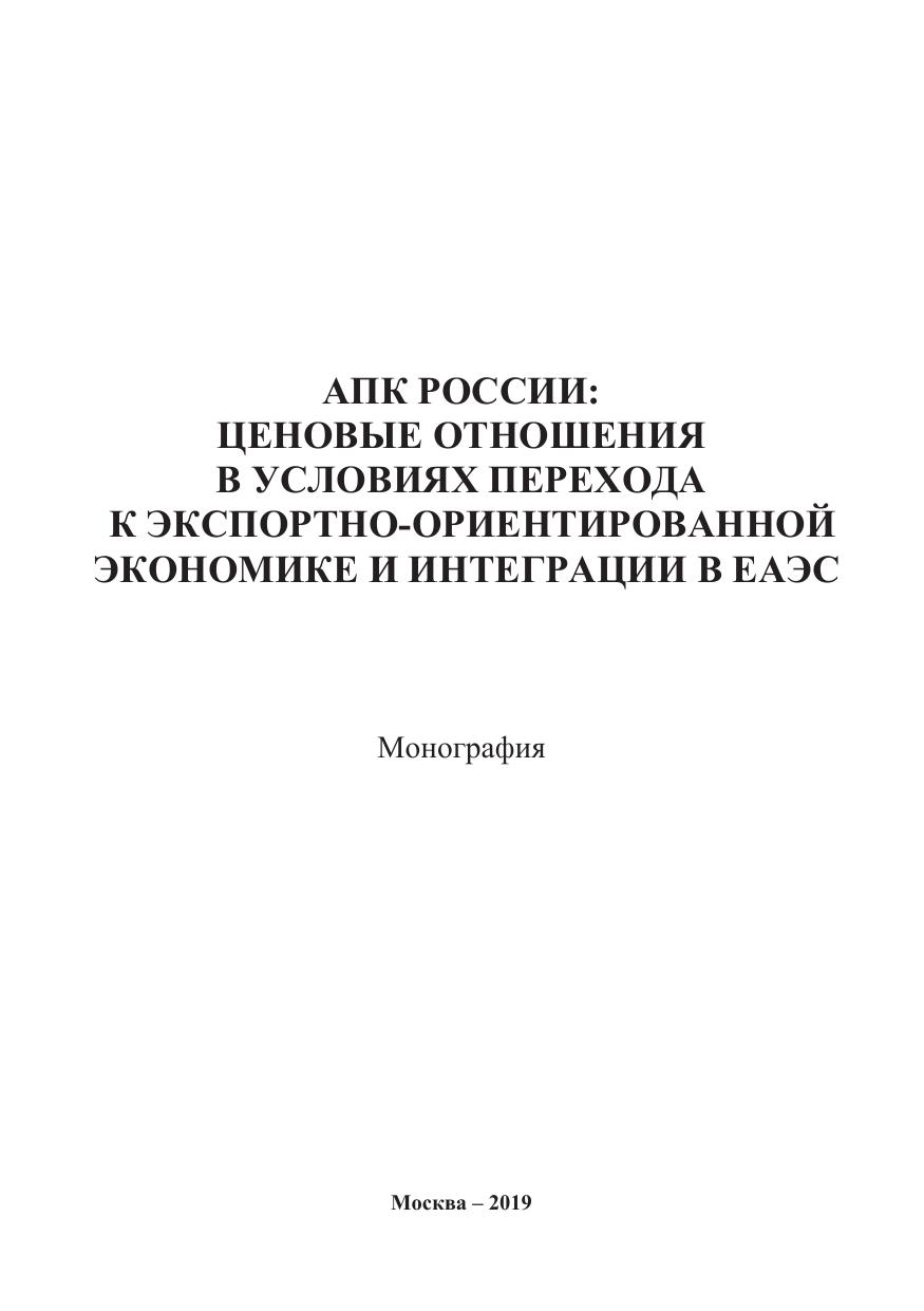 АПК России: ценовые отношения в условиях перехода к экспортно-ориентированной экономике и интеграции в ЕАЭС