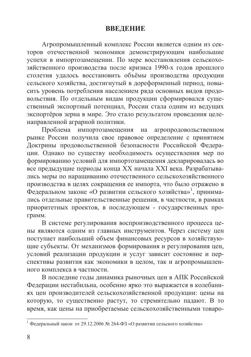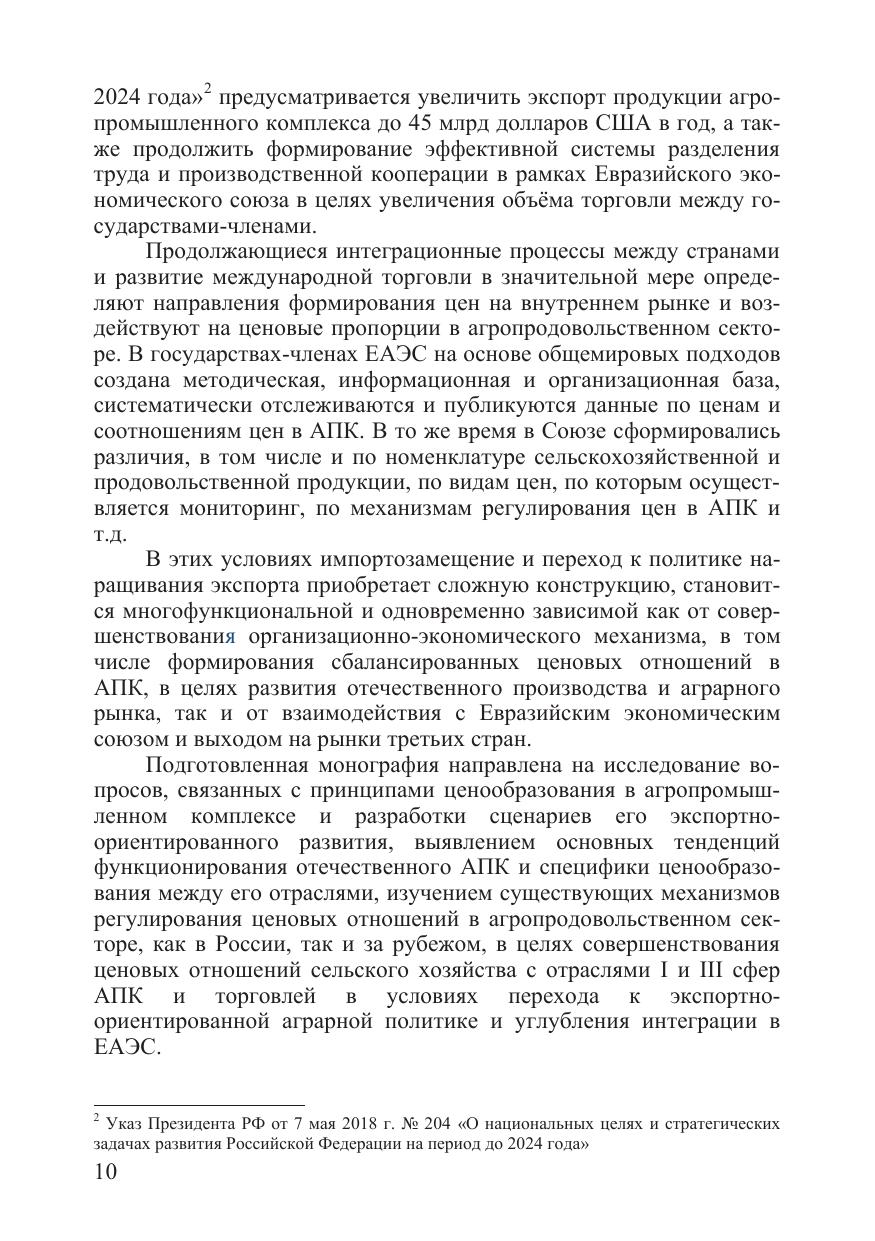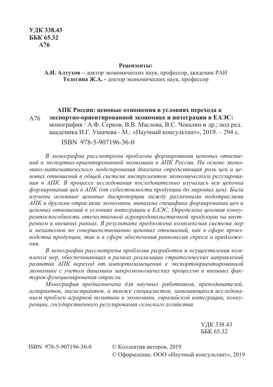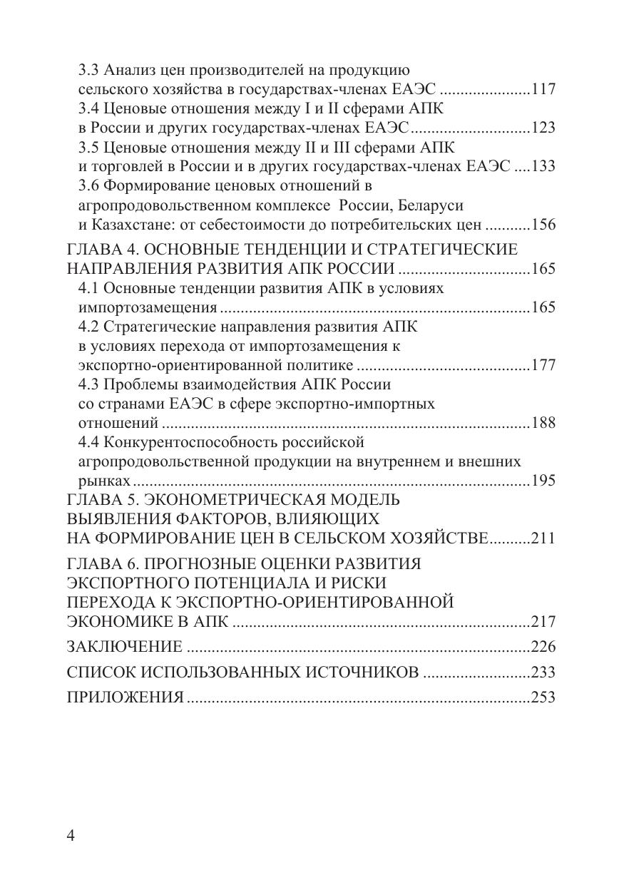 В монографии рассмотрены проблемы формирования ценовых отношений и экспортно-ориентированной экономики в АПК России. На основе экономико-математического моделирования доказана определяющая роль цен и ценовых отношений в общей системе инструментов экономического регулирования в АПК. В процессе исследования последовательно изучалась вся цепочка формирования цен в АПК (от себестоимости продукции до мировых цен). Были изучены основные ценовые диспропорции между различными подотраслями АПК и другими отраслями экономики, выявлена специфика формирования цен и ценовых отношений в условиях интеграции в ЕАЭС. Определена ценовая конкурентоспособность отечественной агропродоволъственной продукции на внутреннем и внешних ранках. В результате предложена комплексная система мер и механизмов по совершенствованию ценовых отношений, как в сфере производства продукции, так и в сфере обеспечения равновесия спроса и предложения. В монографии рассмотрены проблемы разработки и осуществления комплекса мер, обеспечивающих в рамках реализации стратегических направлений развития АПК переход от импортозамещения к экспортоориентированной экономике с учетом динамики макроэкономических процессов и внешних факторов функционирования отрасли. Монография предназначена для научных работников, преподавателей, аспирантов, магистрантов, а также специалистов, занимающихся исследованием проблем аграрной политики и экономики, евразийской интеграции, конкуренции, государственного регулирования сельского хозяйства.