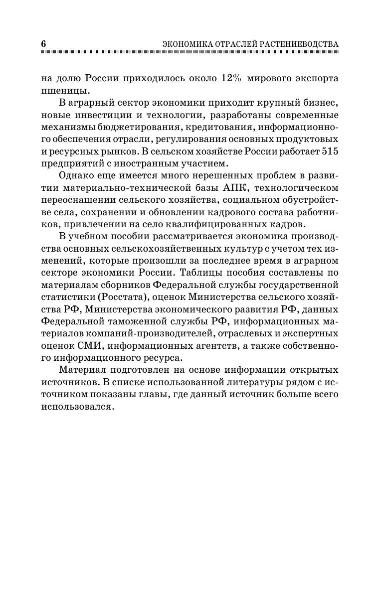 Учебное пособие написано в соответствии с программой курса «Экономика отрасли». В пособии освещаются теоретические основы экономики отраслей растениеводства. В виде самостоятельных тем рассмотрена экономика производства зерна, технических культур, картофеля, овощных и бахчевых культур, садоводства и виноградарства. Учебное пособие может быть полезно студентам аграрных вузов и средних специальных образовательных учреждений, при проведении научных исследований, руководителям и специалистам сельскохозяйственных организаций.