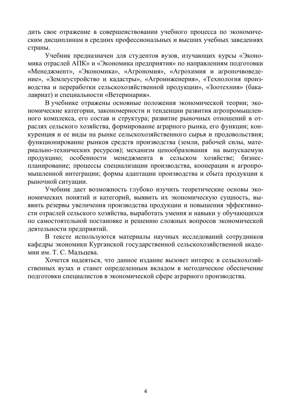 В учебнике отражены закономерности и тенденции развития агропромышленного комплекса, его состав и структура, развитие рыночных отношений в отраслях сельского хозяйства, формирование аграрного рынка, его функции, конкуренция и ее виды на рынке сельскохозяйственного сырья и продовольствия, функционирование рынков средств производства (земли, рабочей силы, материально-технических ресурсов), механизм ценообразования сельскохозяйственного предприятия на выпускаемую продукцию, особенности менеджмента в сельском хозяйстве, бизнес-планирование, процессы специализации производства, кооперации и агропромышленной интеграции, формы адаптации производства и сбыта продукции к рыночной ситуации. Учебник предназначен для студентов аграрных вузов.