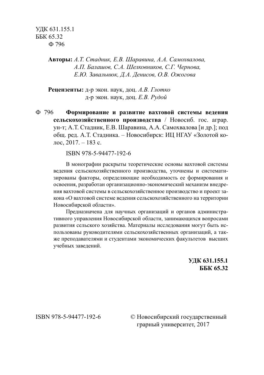 В монографии раскрыты теоретические основы вахтовой системы ведения сельскохозяйственного производства, уточнены и систематизированы факторы, определяющие необходимость ее формирования и освоения, разработан организационно-экономический механизм внедрения вахтовой системы в сельскохозяйственное производство и проект закона «О вахтовой системе ведения сельскохозяйственного на территории Новосибирской области». Предназначена для научных организаций и органов административного управления Новосибирской области, занимающихся вопросами развития сельского хозяйства. Материалы исследования могут быть использованы руководителями сельскохозяйственных организаций, а также преподавателями и студентами экономических факультетов высших учебных заведений.